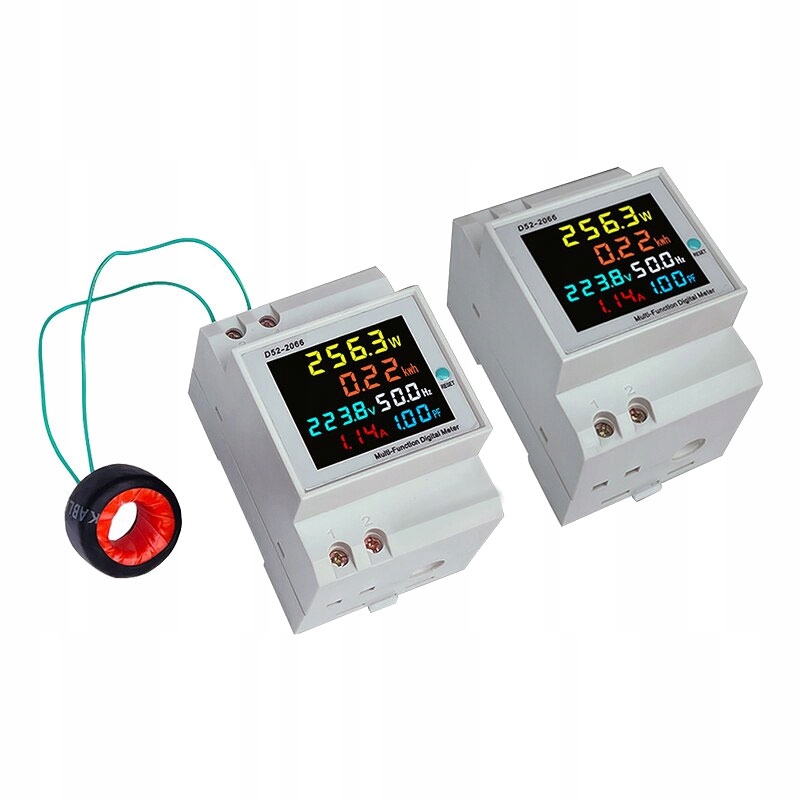 Многофункциональный измеритель D52-2066 позволяет измерять 6 различных электрических параметров сети переменного тока; напряжение, ток, мощность, энергопотребление, частота и коэффициент мощности cosφ. Корпус счетчика предназначен для установки на DIN-рейку TS35 мм. Результаты измерений отображаются разными цветами на ЖК-дисплее. Ток измеряется с помощью измерительной катушки, а не на основе измерения на шунте, как в стандартных решениях. Использование катушки не требует необходимости последовательного подключения к контуру схемы. Все, что вам нужно сделать, это пропустить один провод с током, проходящим через внутреннюю часть катушки.