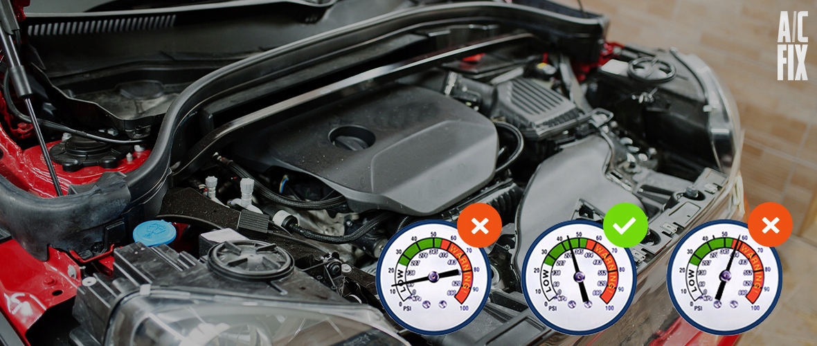 ❌ Показания манометра ниже 25 фунтов на квадратный дюйм — давление в системе кондиционирования воздуха слишком низкое.