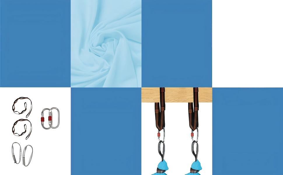 ✔ Упаковка: содержит полный набор воздушного шелка (4 * 2,8 м), 2 карабинеров, 2 расширяющие полоски (1 м), 2 ленты O-Sling.