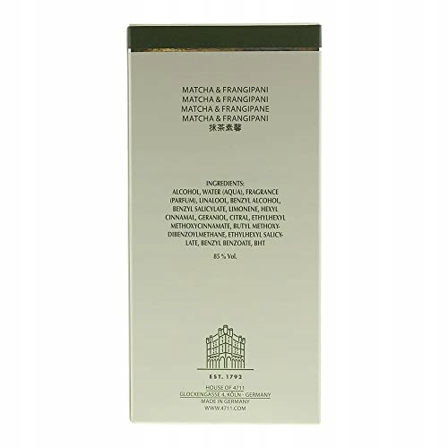 4711 Acca Colonia Matcha & Frangipani - ароматический аромат, подходящий для любого пола. Аромат был создан Матье Нардина и был запущен в 2020 году немецким ароматом 4711. Аромат содержит чай матча и франгипани, которые объединяются для создания чистого, мягкого зеленого аромата из чая матча, с оттенком цветочного франгипани. Вместе ноты свежие, расслабляющие и кремовые, создающие замечательный аромат, особенно в теплые дни весны и лета.