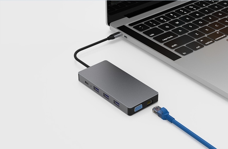 Позволяет подключать множество устройств и носителей с помощью разъема USB C. Он занимает один разъем в устройстве и дает доступ к десяти.