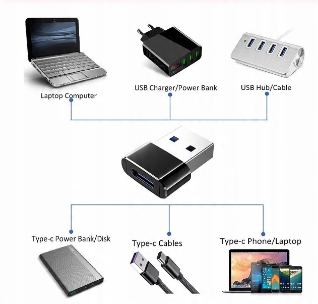 Переходник USB-штекер/разъем USB Type-C — это устройство, позволяющее подключать аксессуары с разъемом USB Type-C к устройствам с входом USB Type-C. Адаптер обеспечивает зарядку и синхронизацию данных в последних моделях ноутбуков, смартфонов и планшетов.