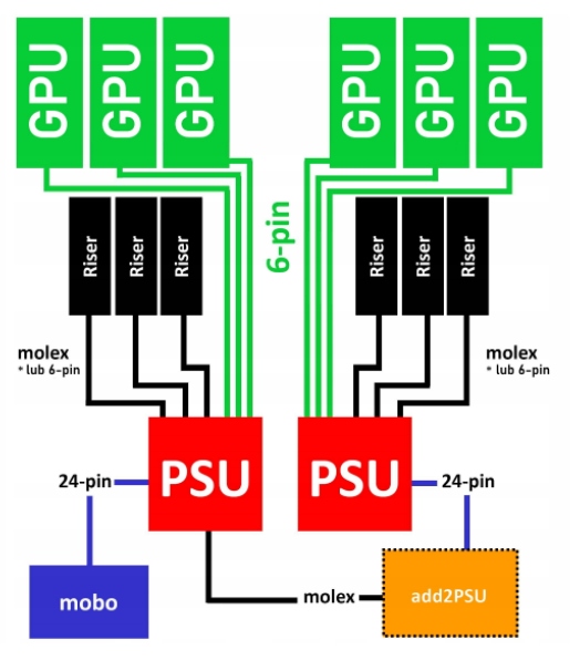Основной блок питания подключите через разъем MOLEX, а дополнительный — через 24-контактный разъем ATX. Способ подключения показан на соседнем изображении, где показано типовое подключение двух блоков питания и подключение к майнеру криптовалюты.