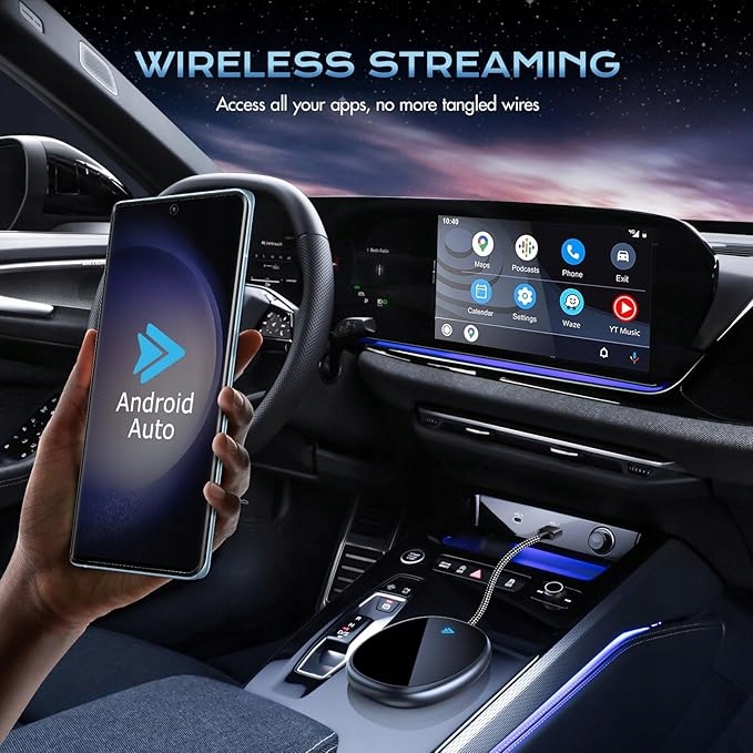 - Вы ищете беспроводное решение для улучшения системы навигации на автомобиль? Не беспокойтесь о запутанных кабелях и не уставившись на телефон во время вождения благодаря этому беспроводному автоматическому адаптеру Android в Великобритании, которая приведет вас к системе Android Auto Wireless для обеспечения более безопасного и более улучшенного путешествия. (System Android требует обновления до версии 11 или более новой.)