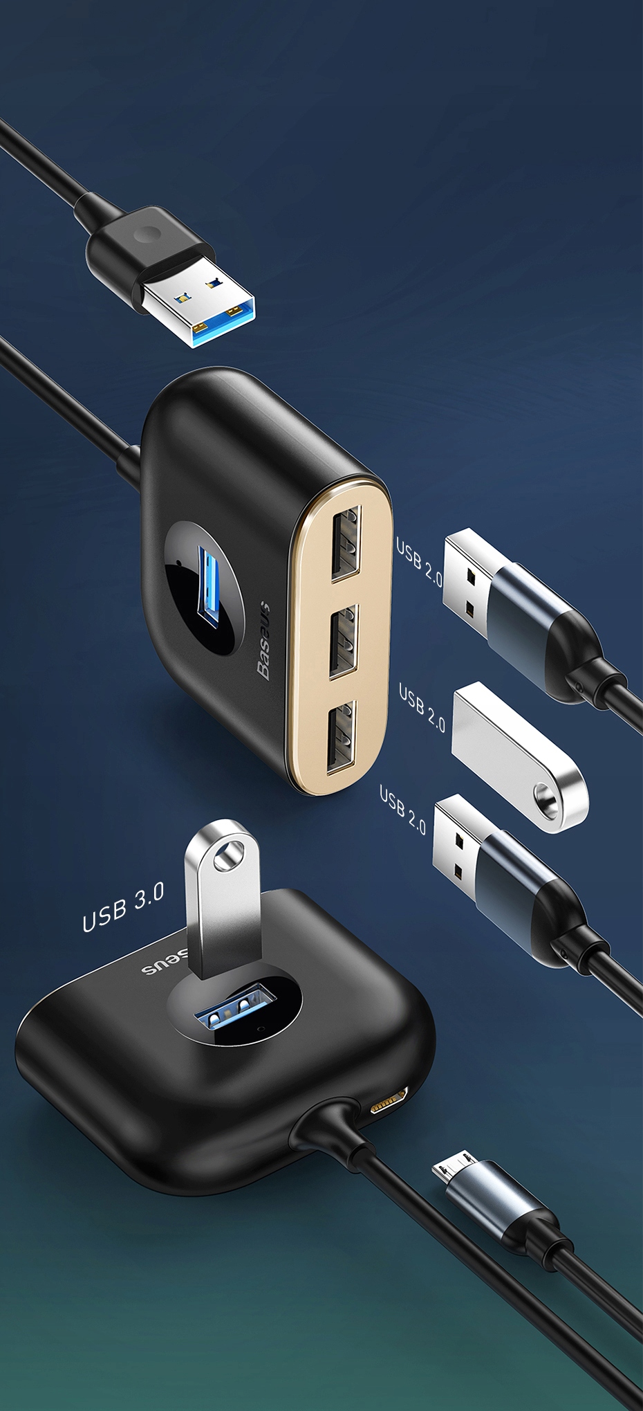 Отличный четырехпортовый концентратор Baseus позволит вам увеличить количество портов на вашем компьютере или ноутбуке. Он обеспечивает постоянную и быструю передачу данных, а поскольку изготовлен из высококачественных материалов, устойчив к незначительным механическим повреждениям и царапинам. Порт micro USB используется для внешнего питания устройств, требующих более стабильного и более высокого напряжения.