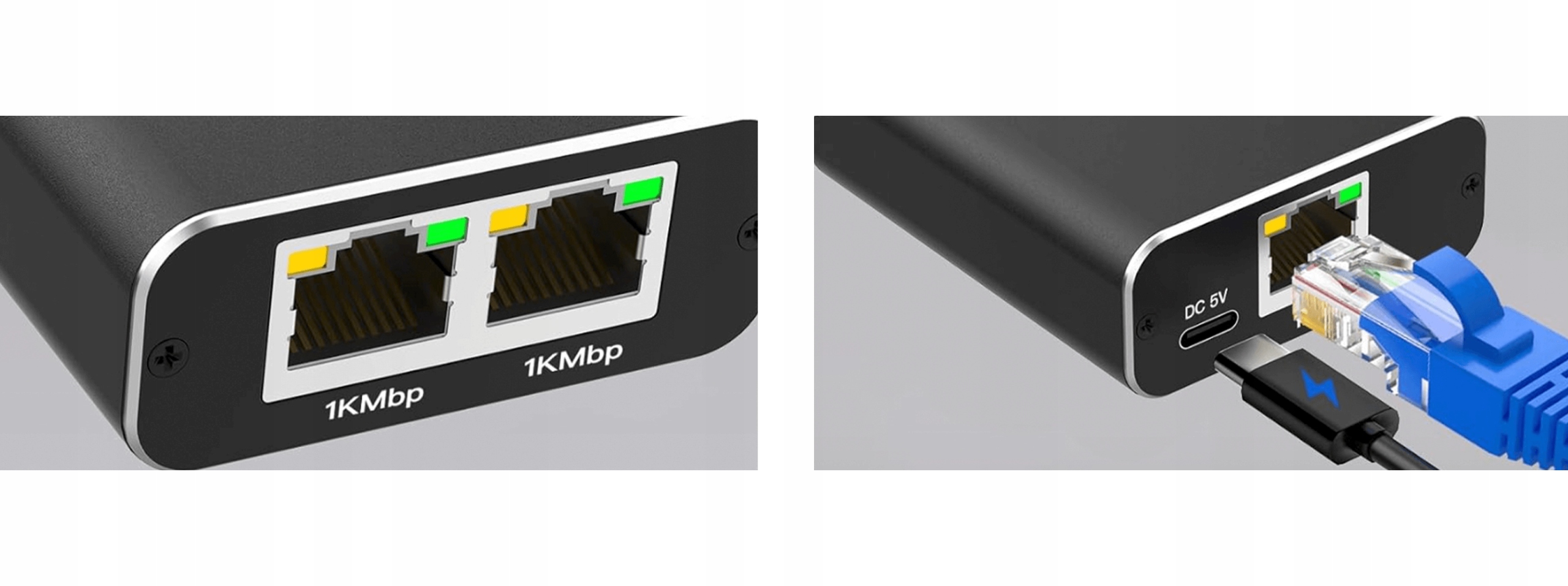 - Порты: 1 вход RJ45, 2 выхода RJ45, 1 USB-C 5 В постоянного тока.