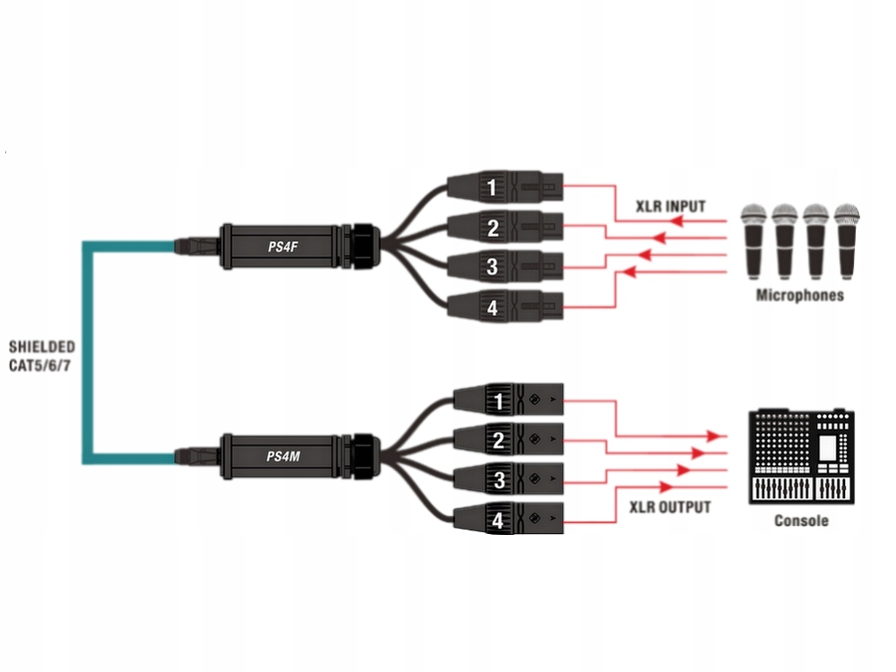 ETHERCON RJ45 — адаптер XLR для передачи четырех каналов AUDIO, DMX, AES/EBU в один сетевой кабель. Пассивная конструкция, не требующая источника питания, пронумерованный жгут проводов, возможность передачи фантомного питания +48 В.