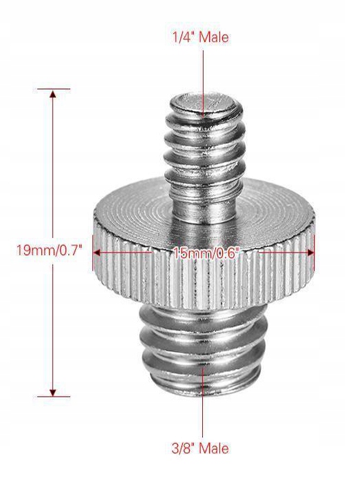 Адаптер с резьбой Spigos, заканчивающийся с одной стороны 1/4 -дюймовой мужской нитью, с другой с нитью 3/8 дюйма. Сделано из нержавеющей стали. Это позволяет установить фотографические аксессуары в клетки оператора и различные типы ручек.