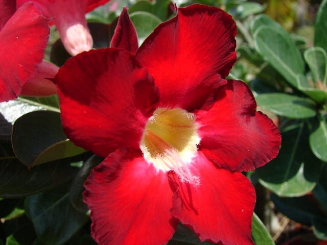 Адениум тучный (адениум выделен жирным шрифтом) 'темный лес' - скрытосеменное суккулентное растение из семейства Apocynaceae, тесно связанное с южноевропейским олеандром. За красивые и насыщенные цветки яркой окраски, а также за очень хорошую переносимость сухого воздуха (поэтому подходит и для квартир) она получила поэтическое чешское название роза пустыни. Родина этого растения – африканские полупустыни. Оттуда он достиг Таиланда, Вьетнама и Лаоса и теперь широко распространен по всему миру, причем большинство новых цветовых разновидностей создается в Юго-Восточной Азии. В природе адениум растет как кустарник или небольшое деревце с утолщенным стволом, иногда странной формы, частично скрытым под землей. Кора ствола гладкая, светло-серая, серо-коричневая или серо-зеленая. Листья вечнозеленые, частично опадающие. Они растут на ветвях спиралями, утолщаются на верхушках побегов, блестящие и жесткие, средней и темно-зеленой окраски, длиной 5-15 см, шириной 1-8 см и больше всего напоминают листья олеандра. Однако самой большой гордостью растения являются невероятно красивые трубчатые цветки, имеющие пять листьев длиной 2 – 5 см и имеющие множество цветовых оттенков от белого до карминно-красного, иногда с окрашенным в другой оттенок краем или с другим окрашенным центром. Однако помните, что самые красивые формы имеют растения, выращенные из семян, однако окраска и форма цветка могут не соответствовать указанному виду. Цвет цветков соответствует только привитым или посаженным растениям. Опыленные цветки дают плоды серого или серо-коричневого цвета, вытянутые с обоих концов, с длинными и узкими семенами, снабженными шелковистым золотистым пухом. Интересен тот факт, что растение при повреждении выделяет ядовитый сок, тем самым предотвращая вторжение, и который туземцы на своей родине используют для изготовления отравленных стрел. Однако при нормальной эксплуатации и возможном повреждении растения существенной опасности нет, просто будьте осторожны с домашними животными и детьми. В нашей стране адениум выращивают как неприхотливое, очень декоративное экзотическое горшечное растение, особенно подходящее для создания цветущих суккулентов бонсай.