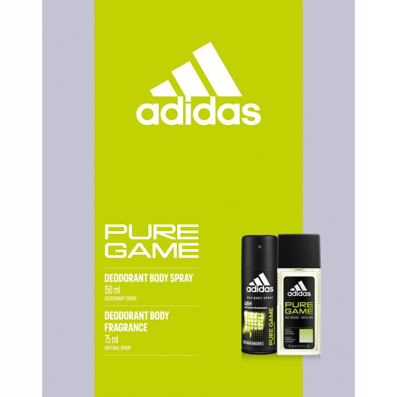 - Парфюмированный дезодорант Adidas Pure Game 75 мл — Adidas Pure Game — современный, слегка пряный аромат для мужчин. Головная часть парфюма отражает горьковатый вкус грейпфрута и сочного мандарина, приправленного базиликом и острым перцем. Пряные тона открываются в сердце парфюма, где доминируют ноты лаванды и кипариса. База парфюма – уникальное сочетание тропических нот пачули, бобов тонка и ладана.