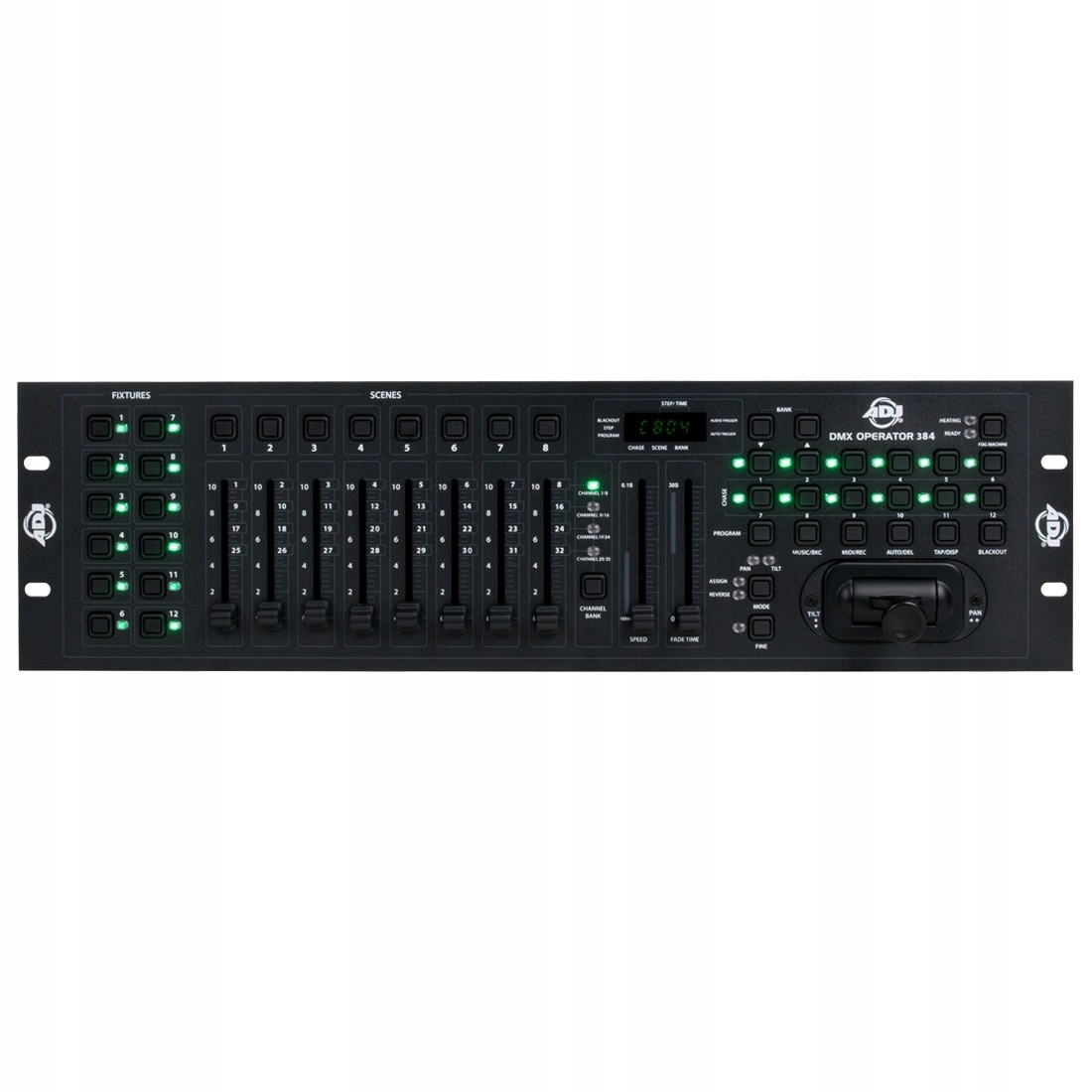 Оператор DMX 384 - 19 -дюймовый контроллер стойки, поддерживающий протокол DMX и MIDI. Элементы управления до 384 каналов DMX имеют 30 программируемых сцен библиотеки (обычно 240 программируемых сцен), 12 триггеров и управление джойстикой.