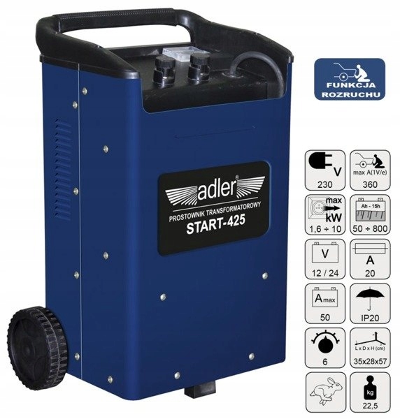 - Трансформатор-выпрямитель Adler START-425 с функцией поддержки пуска — устройство для зарядки свинцово-кислотных аккумуляторов.