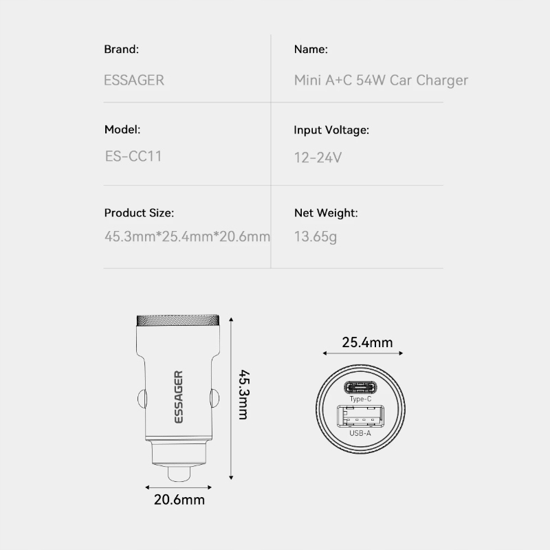 Ładowarka Samochodowa 54W Essager z USB A+C do Auta Czarna + Podświetlenie