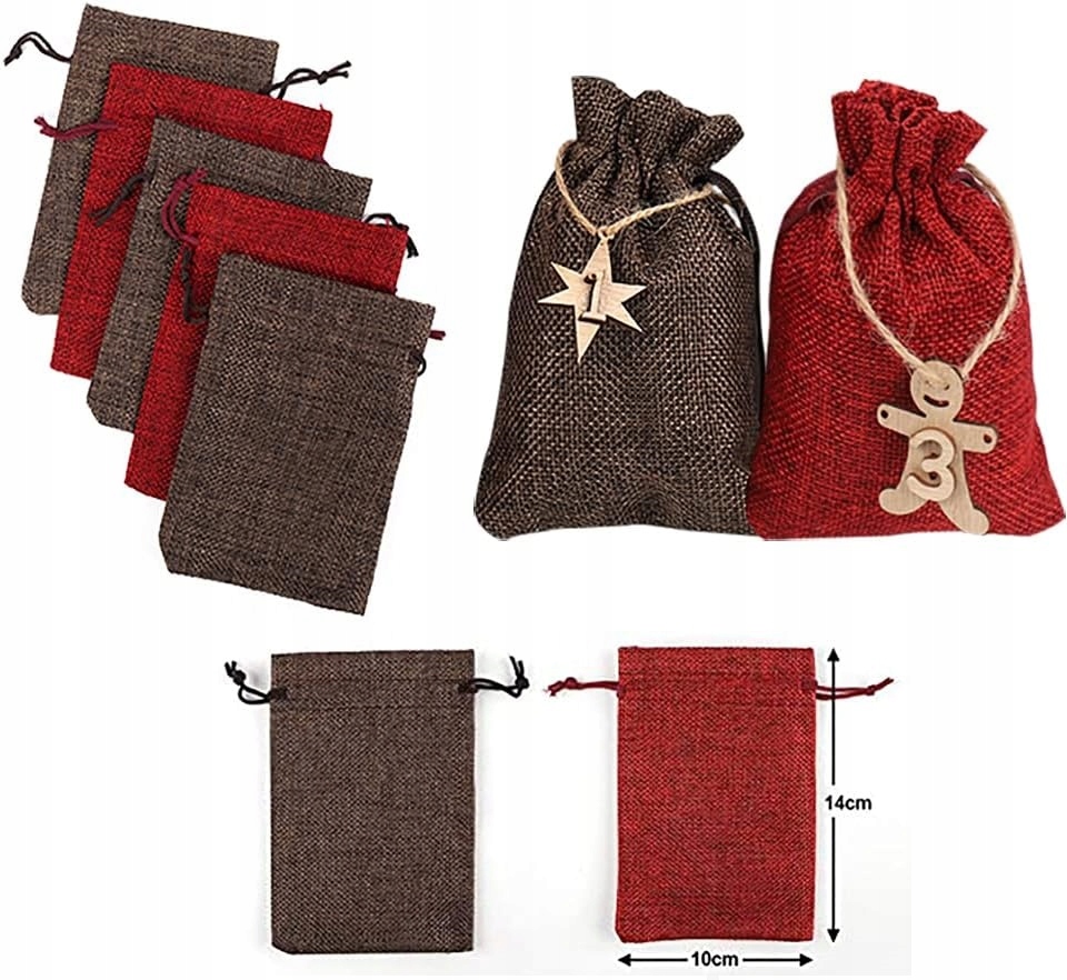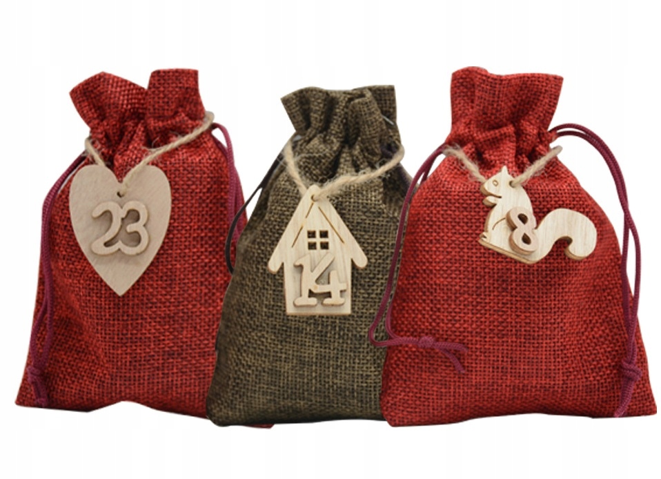 Окончательный вид мешочков решаете вы! В комплект входят специальные многоразовые бирки для каждой сумки — удобный способ их нумерации. Адвент-календари для заполнения — прекрасная возможность создать что-то оригинальное и адаптировать подарки к потребностям вашего ребенка. Практичные джутовые сумки незаменимы для любителей DIY. Сумки могут быть индивидуально декорированы пайетками или жемчугом и принтом.