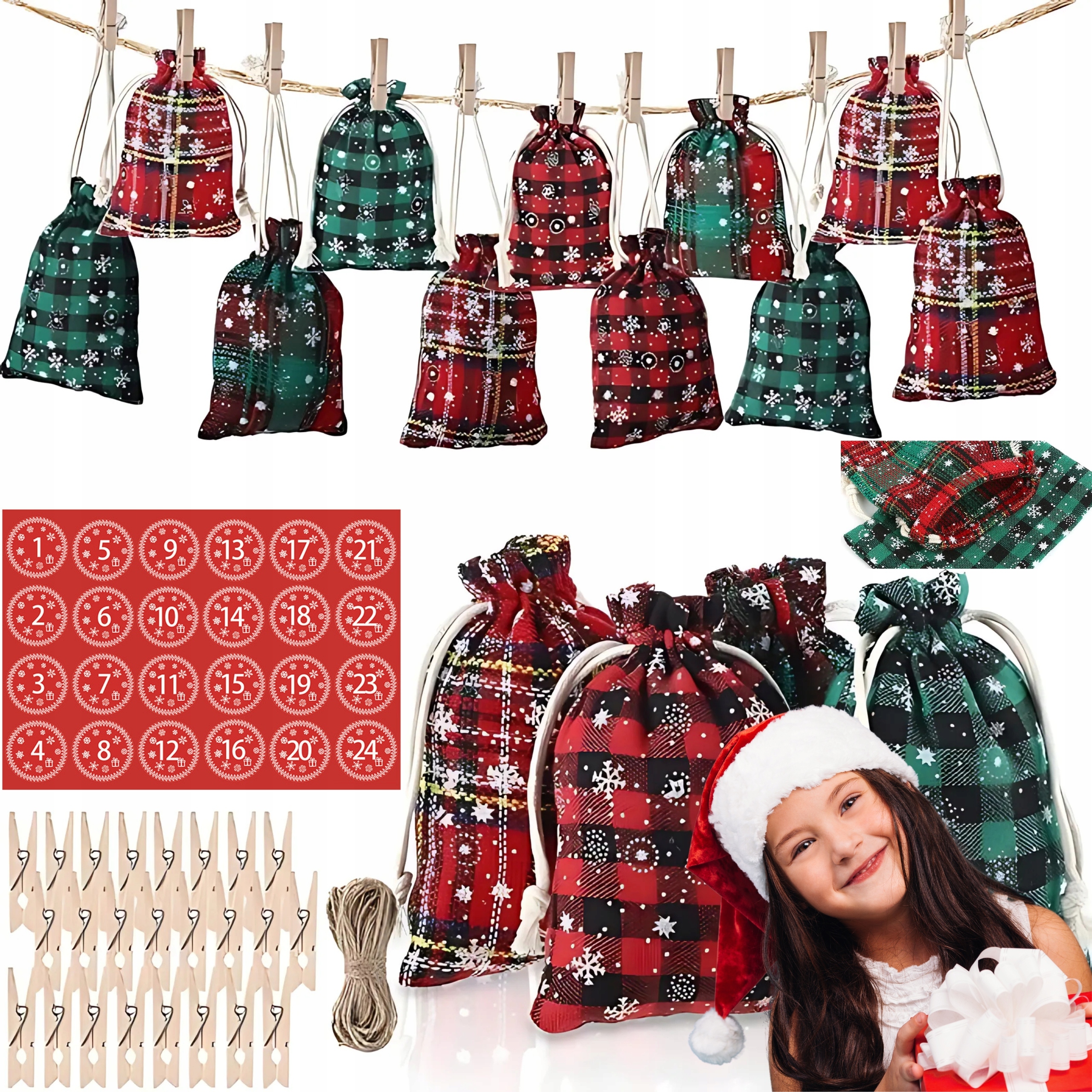 Принесите атмосферу Рождества в свой дом с помощью этого уникального адвент-календаря! В комплект входят 24 мешочка с рождественскими узорами, наклейки с номерами, прищепки и джутовая веревка, что позволяет создать очаровательный подвесной календарь. Вы можете наполнить каждый пакет небольшими подарками, сладостями или небольшими сюрпризами — это идеальный способ отсчитывать дни до Рождества в радостной атмосфере.