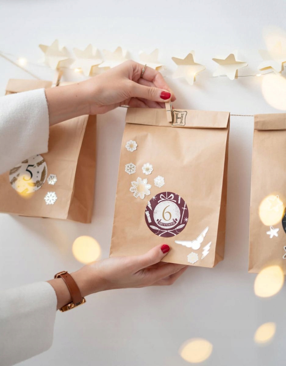 Небольшие подарки, такие как косметика, небольшие игрушки, гаджеты или сладости, можно положить в просторные пакеты из крафт-бумаги. Каждую сумку можно украсить яркими наклейками с цифрами и золотыми снежинками или звездочками. Можно повесить все это дело на джутовую веревку, прикрепив пакеты деревянными зажимами.