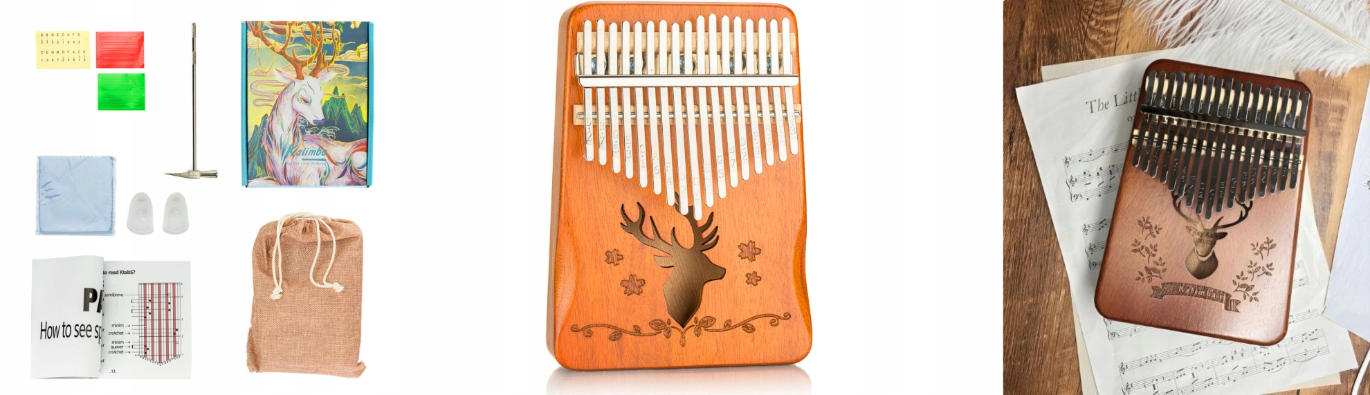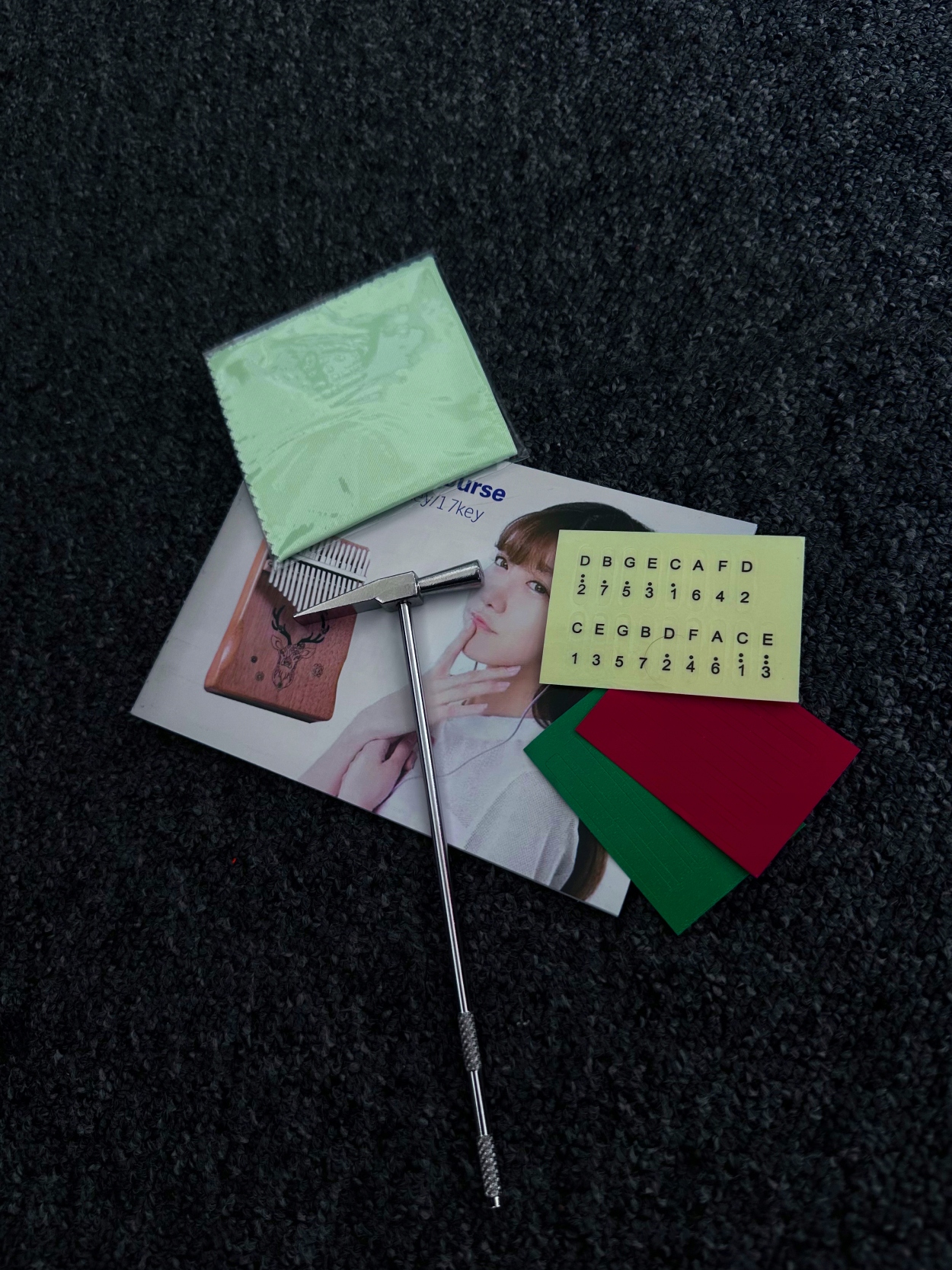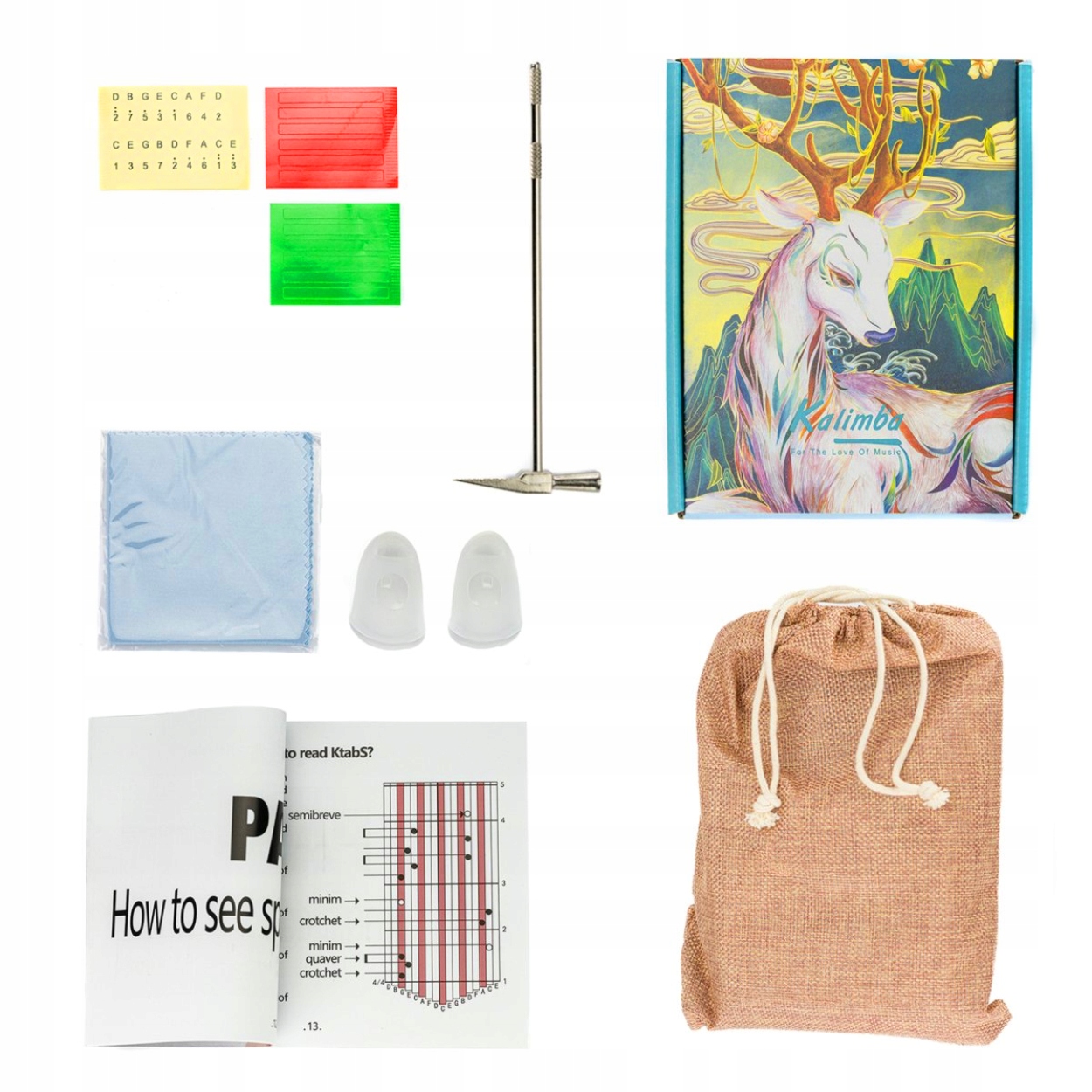 В комплект входит все, что позволит вам сразу же насладиться музыкой - калимба, настроечный молоток, ткань, элегантный футляр и инструкция по игре.