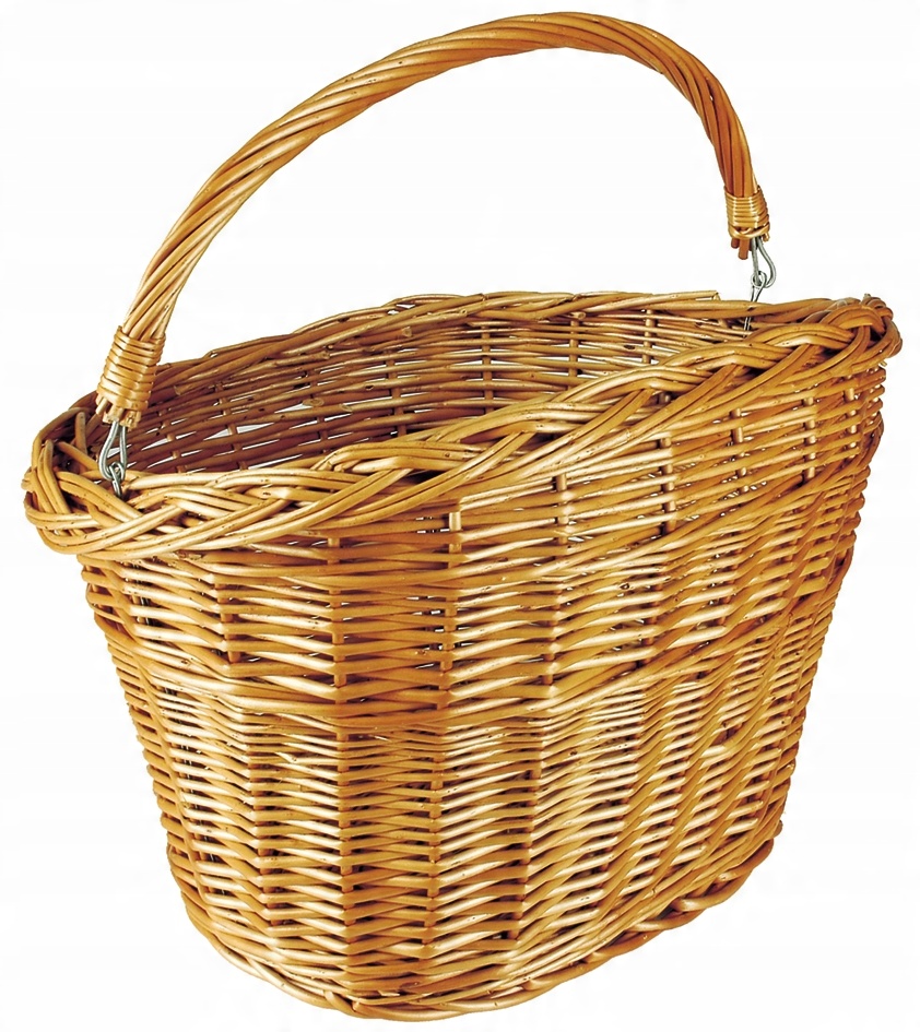 Овальная плетеная велосипедная корзина для крепления на руле или сбоку задней стойки с помощью крючков. Оснащен ручкой для переноски.