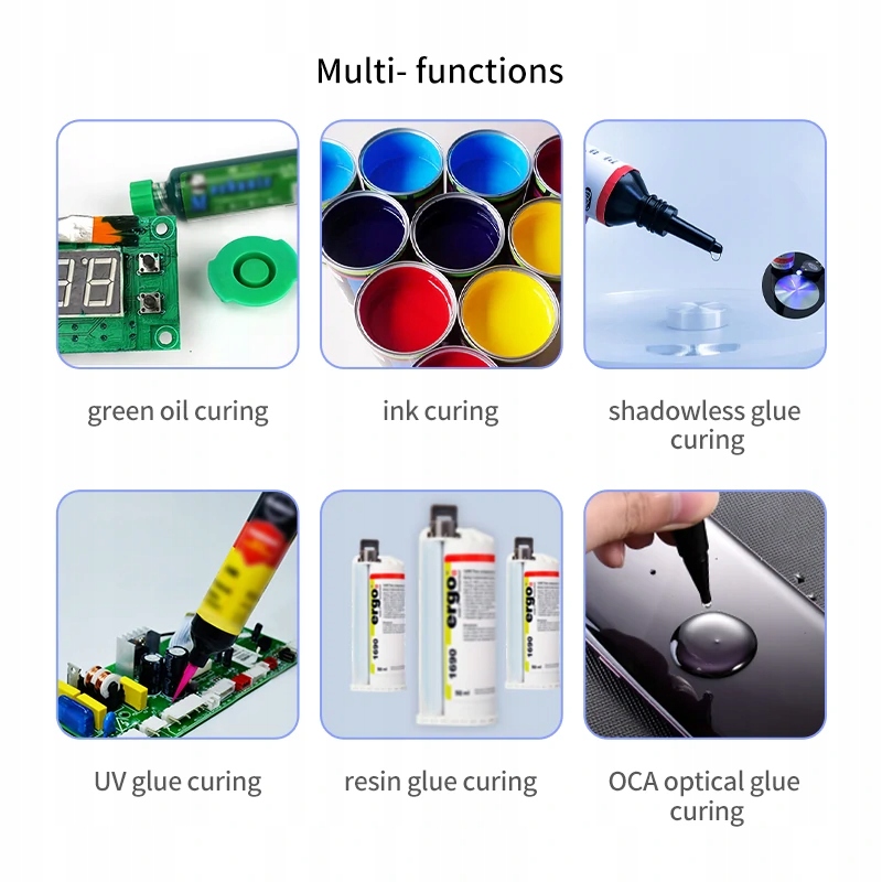- применение: затвердевание чернил, паяльные маски, бестеневое затвердевание клея, УФ-клей, смоляной клей, оптический клей OCA