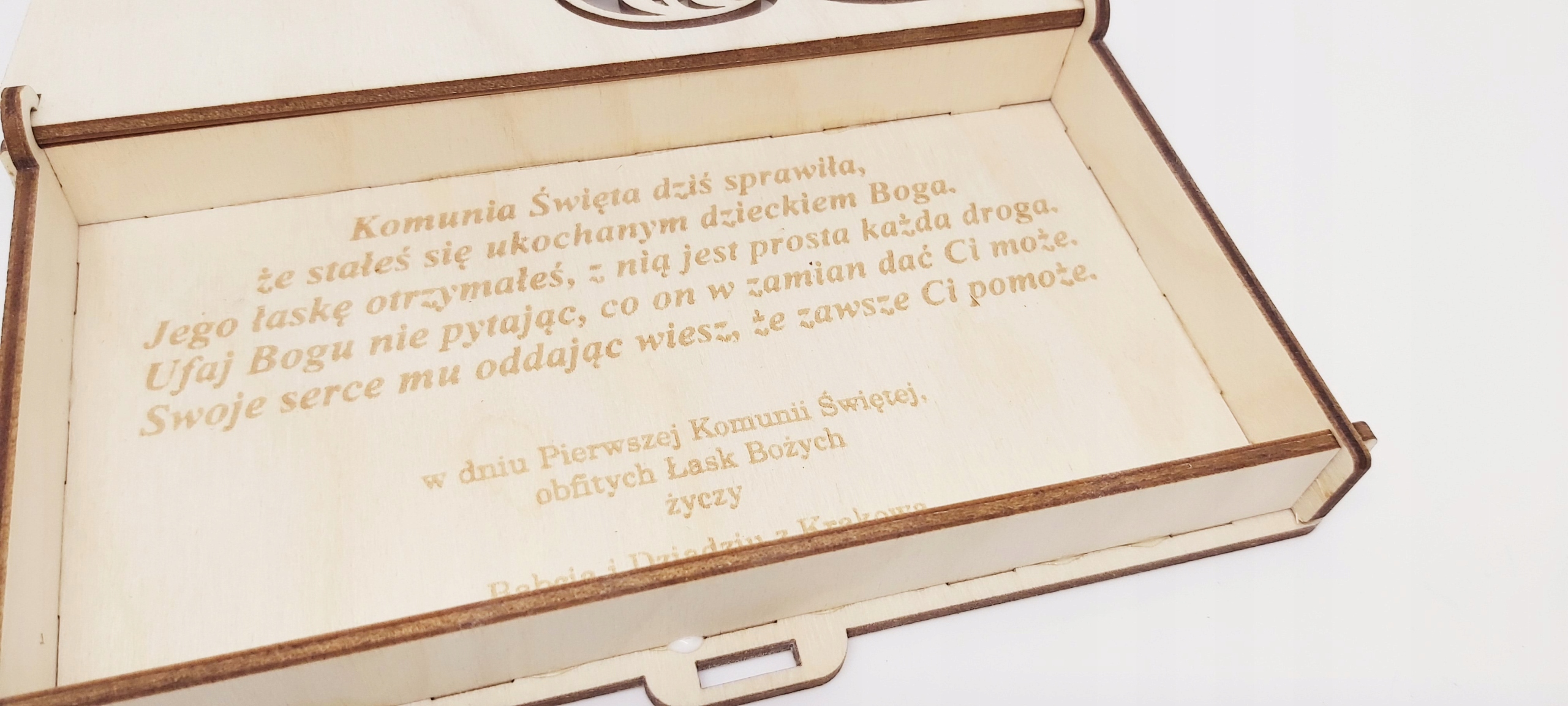 Красивый сувенир к Первому Причастию. Гравировка выдержит испытание временем и не испортится, как лист бумаги. Оригинальный внешний вид шкатулки наверняка привлечет внимание многих гостей.