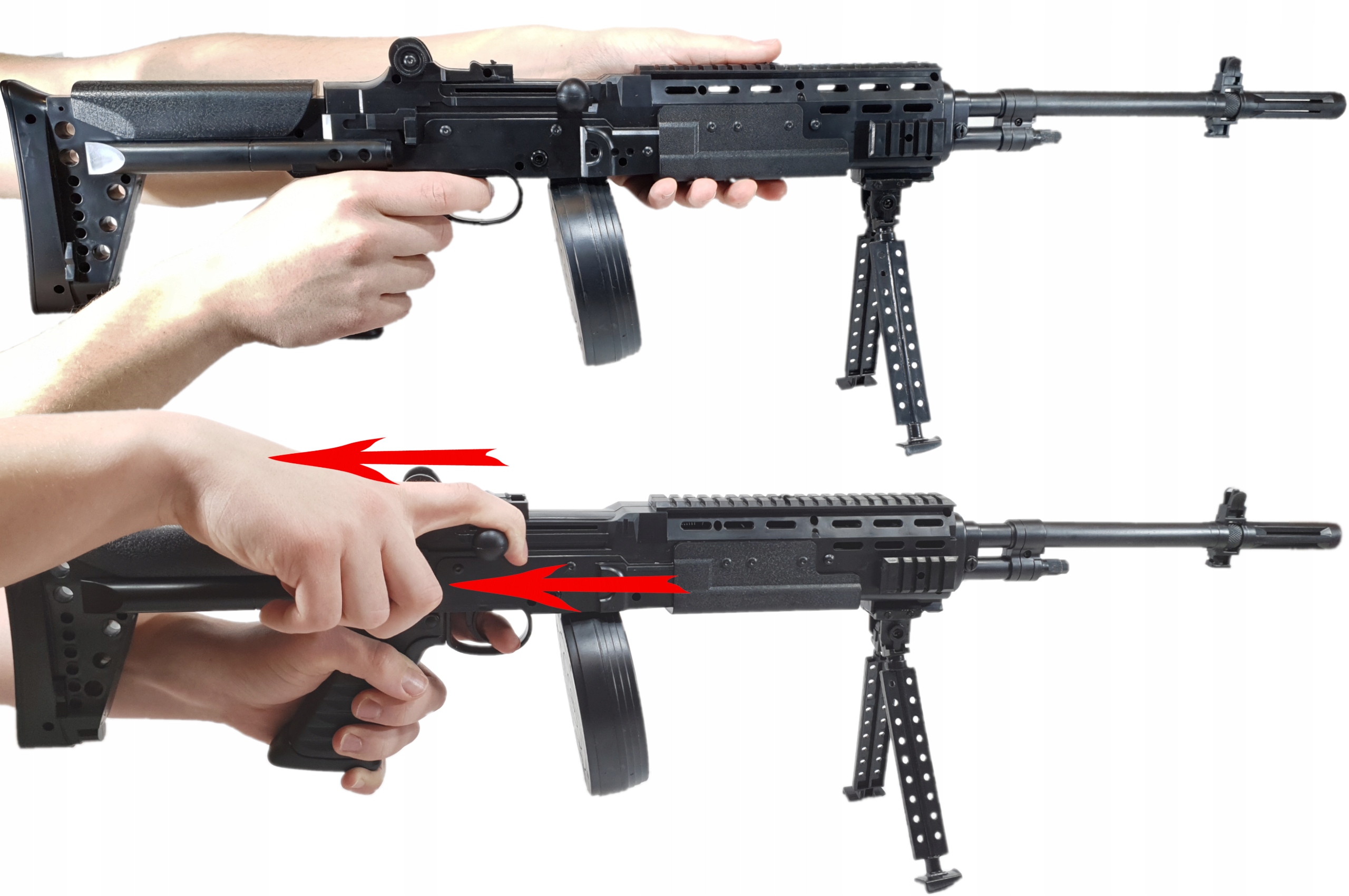 ПОМНИТЕ правило – одна перезарядка, один выстрел. Несколько перезарядок ружья без выстрела приведет к попаданию в патронник нескольких шариков, что может привести к повреждению реплики.