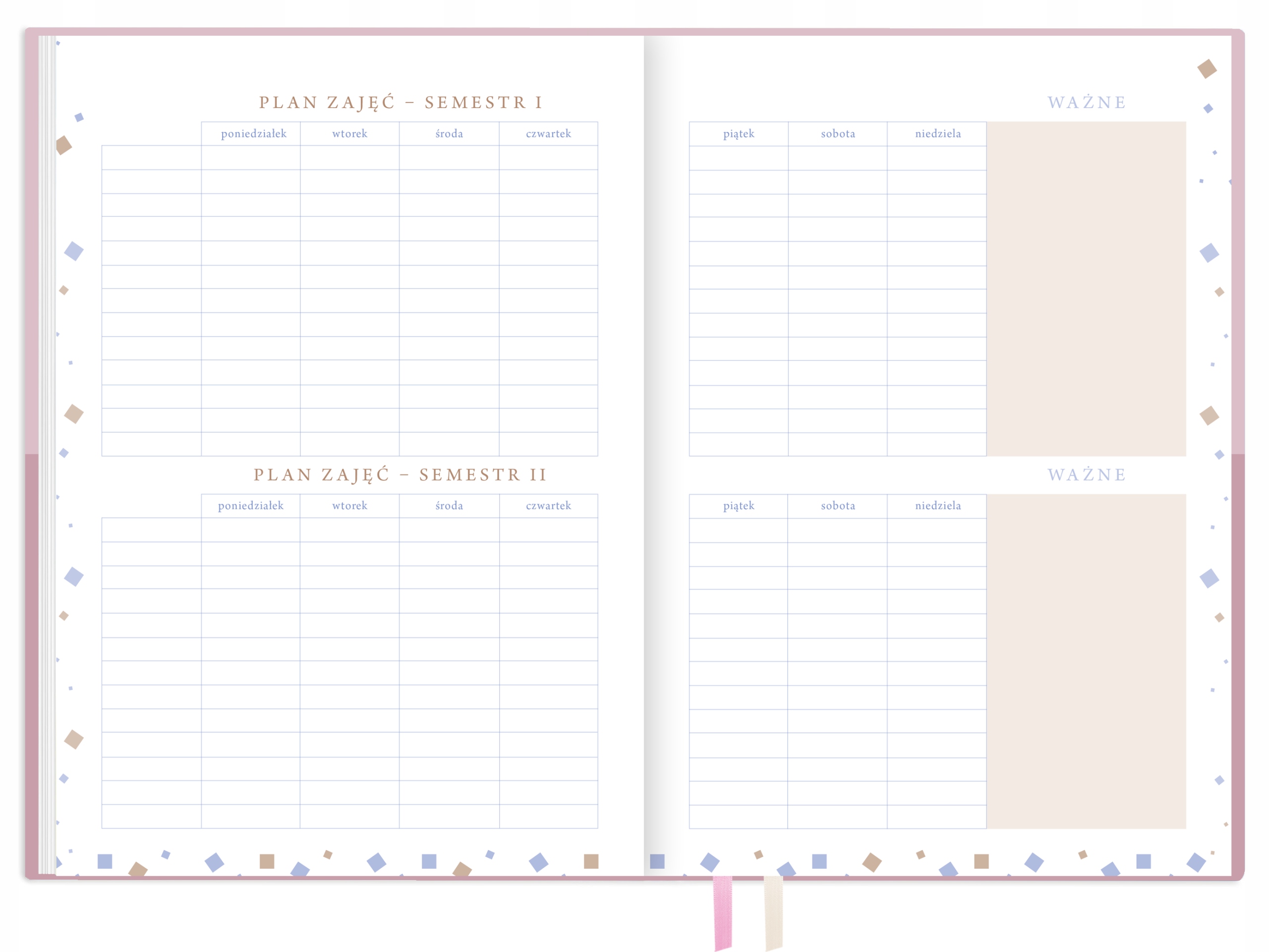 Каждая неделя занимает один разворот (две страницы). Для удобства и лучшей организации своего дня раздел недельного планирования разделен на учеба и остальная жизнь.