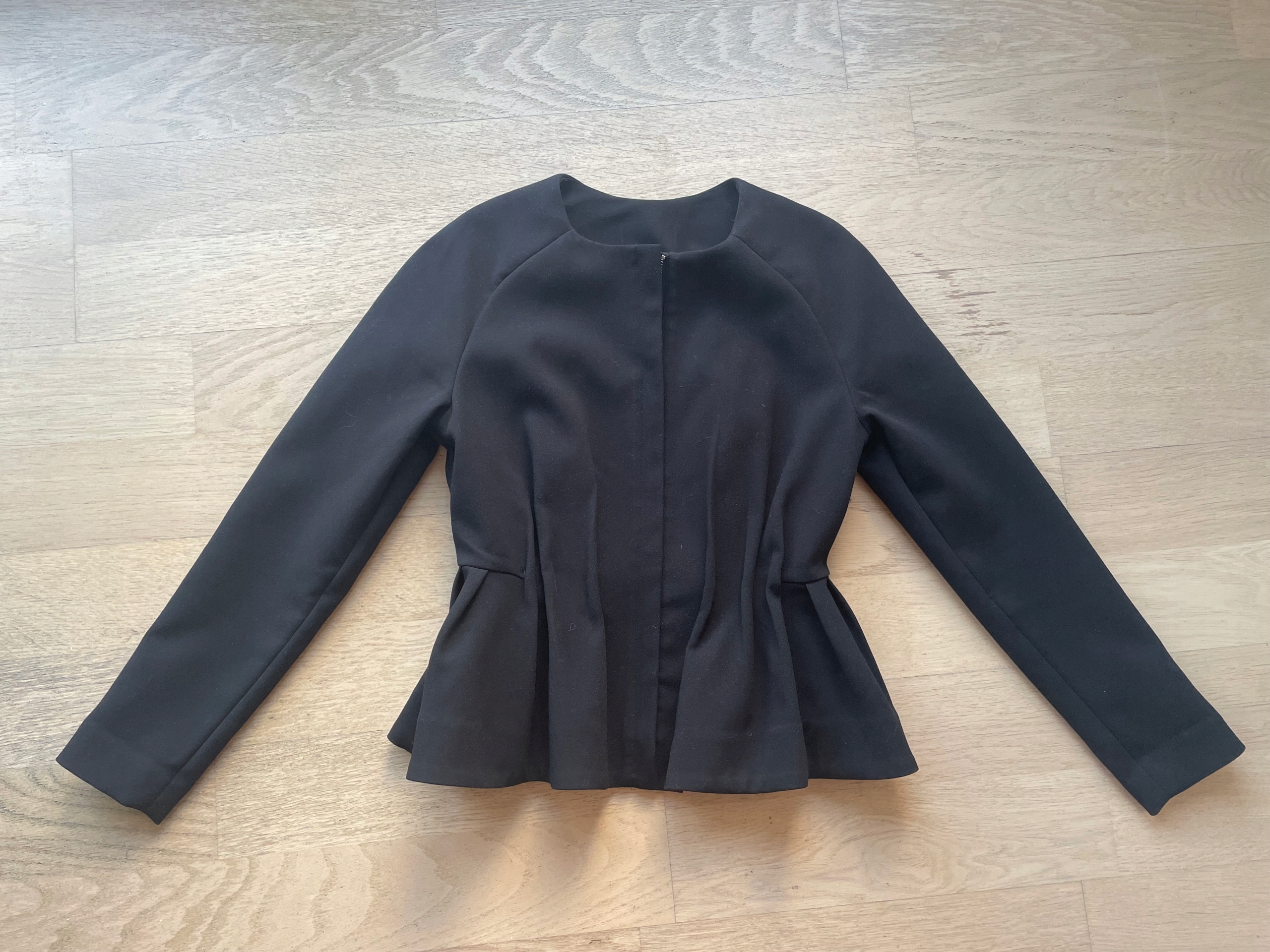 Черный жакет с баской, застегивающейся на молнию, с резинкой на талии, вызывающей складки по типу баски. Размер 136, длина рукава от шеи 70 см, от подмышки 45 см, общая длина 58 см, ширина под мышками 49 см. Полиэстер 67%, Вискоза 30%, Эластан 3%. Очень хорошее состояние. ПОЖАЛУЙСТА, ПОКУПАЙТЕ ВНИМАТЕЛЬНО, ТАК КАК Я НЕ ПРИНИМУ НАЗАД.