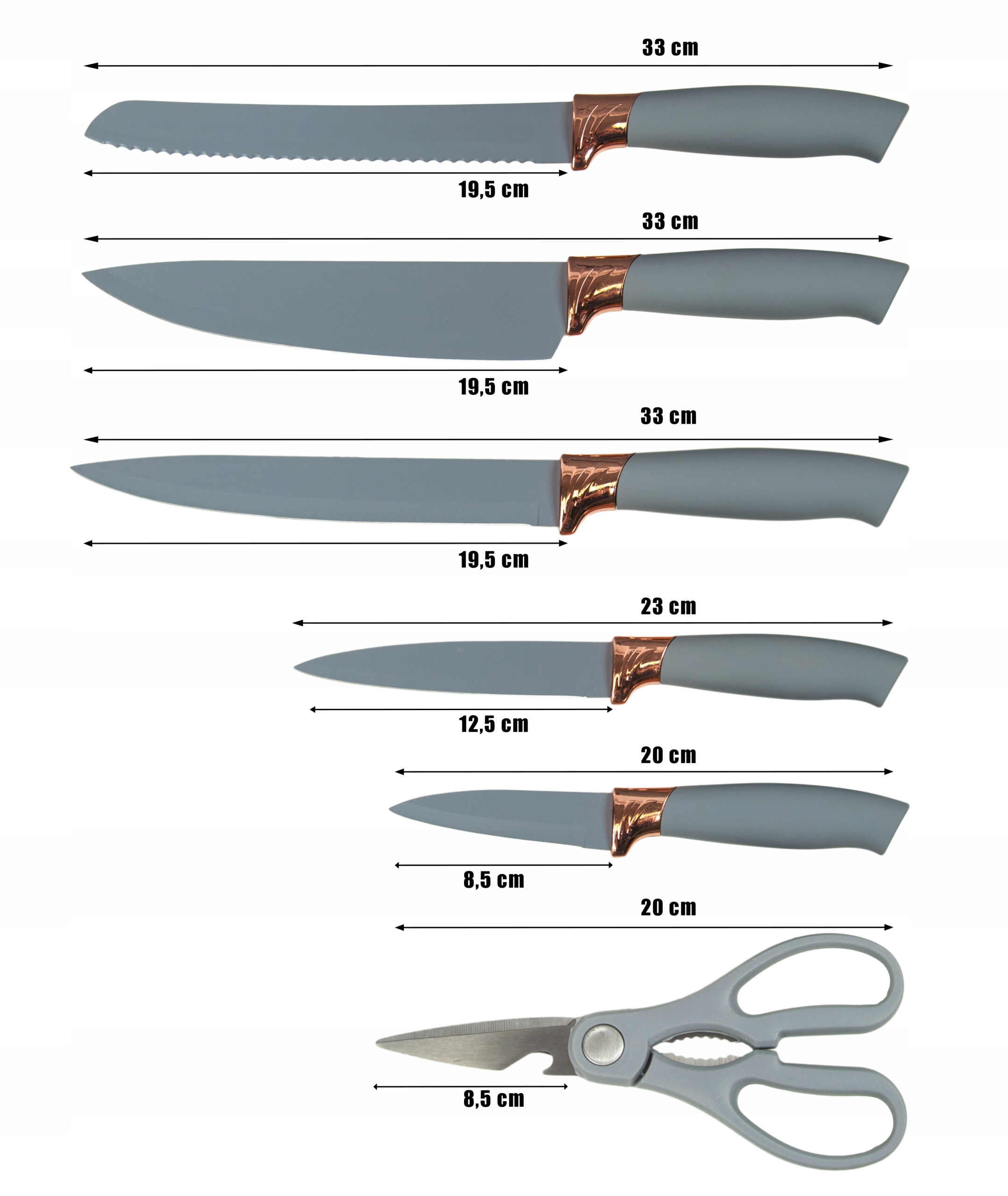 - Нож для хлеба - общая длина 33 см, лезвия 19,5 см.