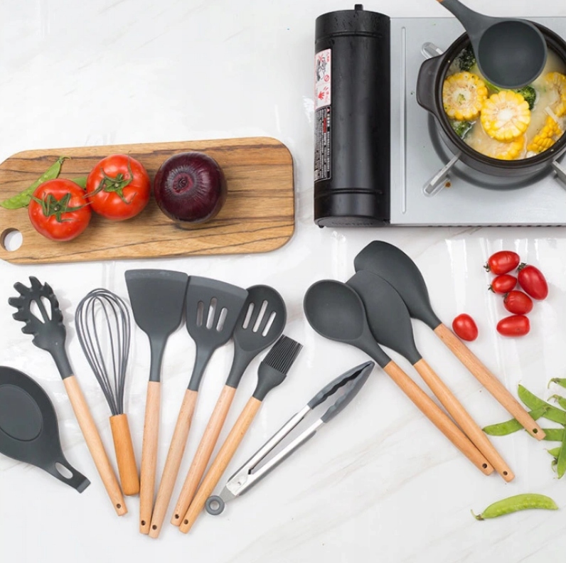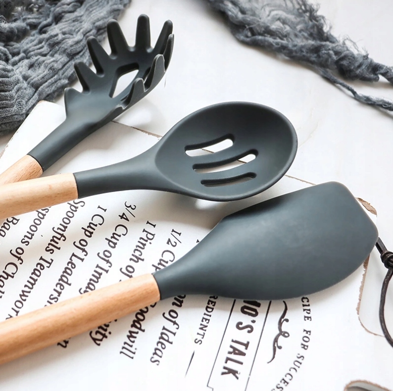 Силиконовые кухонные аксессуары – дизайнерские и в то же время очень функциональные. Комплект состоит из целых 19 элементов графитового цвета, которые помимо своей практичности украсят любой интерьер. Преимуществом кухонных гаджетов из силикона является не только эстетика изготовления, но и удобство использования, ведь посуда устойчива к высоким и низким температурам. Диапазон допустимых температур от -30 до 230 градусов. Однако ручки из бамбукового дерева не нагреваются, поэтому можно не беспокоиться об ожогах.