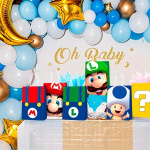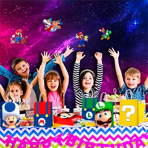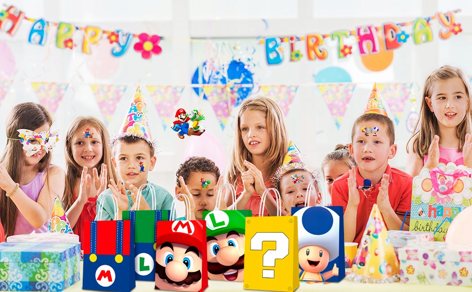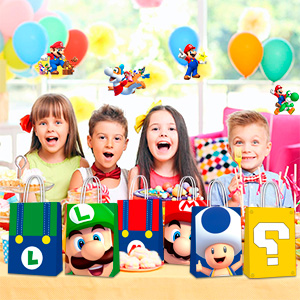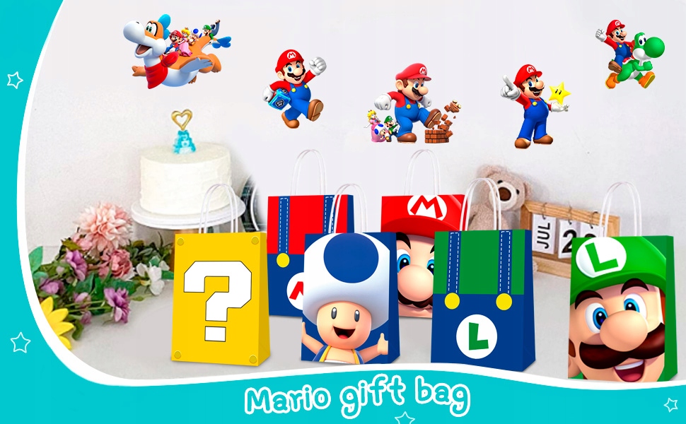 - ⭐Набор принадлежностей для вечеринки по случаю дня рождения Super Mario⭐ Наш набор принадлежностей для вечеринки в стиле Super Mario включает в себя 24 тематических подарочных пакета Super Mario, 50 тематических сумок Super Mario наклейки, которые могут использовать 24 гостя на вечеринке по случаю дня рождения Супер Марио.