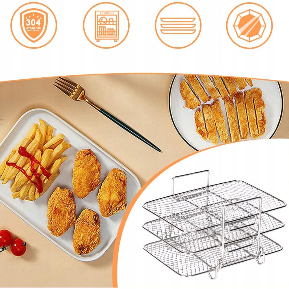 ➡️Полное использование пространства: Разработан с тремя уровнями пространства для размещения продуктов, что увеличивает вместимость фритюрницы и позволяет готовить больше продуктов одновременно, не прикасаясь к ним. Сетчатая конструкция обеспечивает оптимальную циркуляцию воздуха, делая пищу более хрустящей.