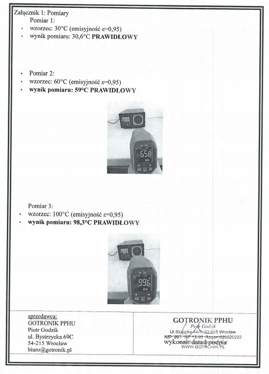 Предлагаем сертификат проверки на пирометры производства Uni-T. Это дополнительная услуга, которую можно оказать при совершении покупок в нашем магазине, при использовании устройства и после гарантии. Проверяем его с помощью калиброванного калибратора температуры Voltcraft IRS-350. Измерения производятся в 3 точках со значениями: 30°C, 60°C и 100°C с заданным коэффициентом излучения 0,95. В документе указана дата проведения проверки, серийный номер прибора и фотографии для каждой точки измерения. Предлагаемая услуга представляет собой сертификат проверки и не эквивалентна сертификату калибровки.