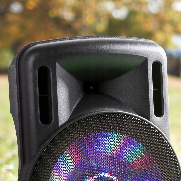 Портативная колонка Fenton FT15LED мощностью 800 Вт позволит организовать замечательную вечеринку. Благодаря встроенному аккумулятору колонку FT15LED можно использовать где угодно, без необходимости искать розетку. FT15LED оснащен 15-дюймовым низкочастотным динамиком и светодиодами с функцией включения/выключения. Световые эффекты и соответствующее качество звука в колонке Fenton подарят много часов отличного удовольствия. Дополнительным преимуществом колонки является наличие в комплекте беспроводного микрофона с эффектом эха, который отлично подойдет для караоке-вечеринок, девичников или мальчишников. Также FT15LED имеет инструментальный вход, к которому можно подключить, например, гитару.