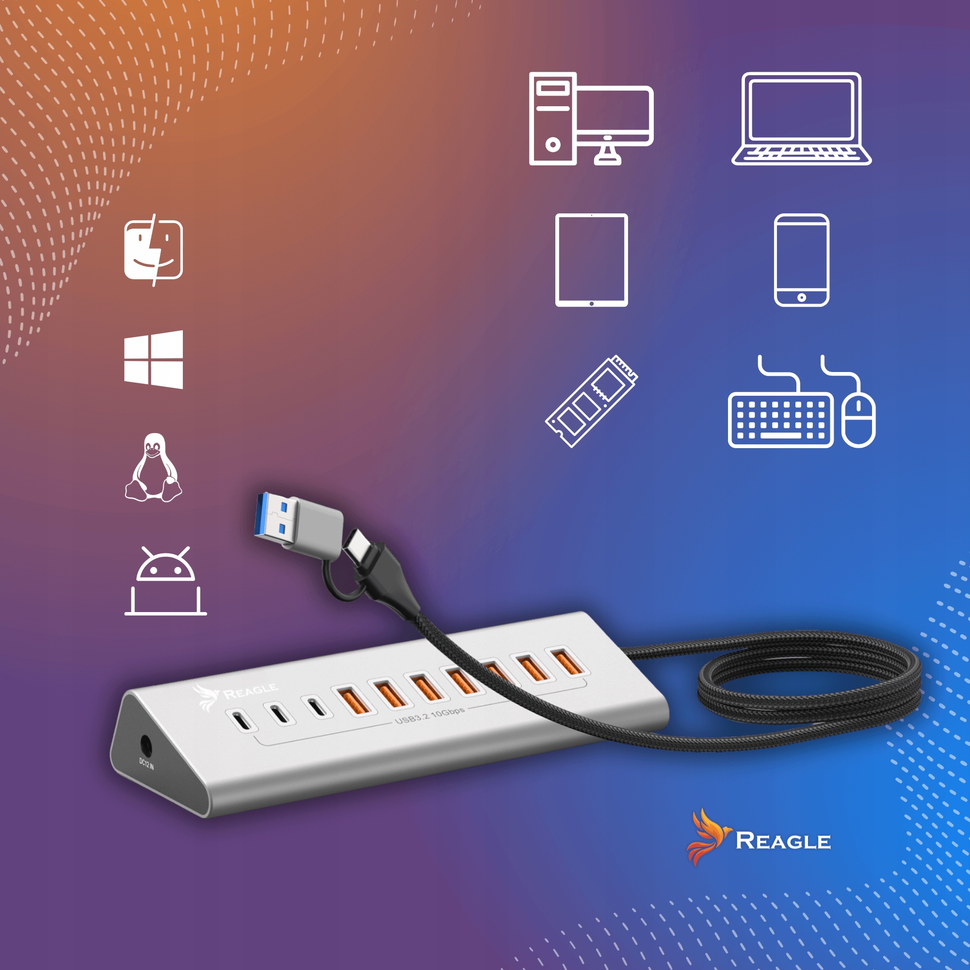 Хаб Reagle RHUB66AC идеально подходит для удаленной работы, офисной работы и презентаций. Независимо от того, используете ли вы ноутбук, MacBook, настольный компьютер или ультрабук — благодаря кабелю USB-A/USB-C 2-в-1 вы можете подключить HUB практически к любому устройству.