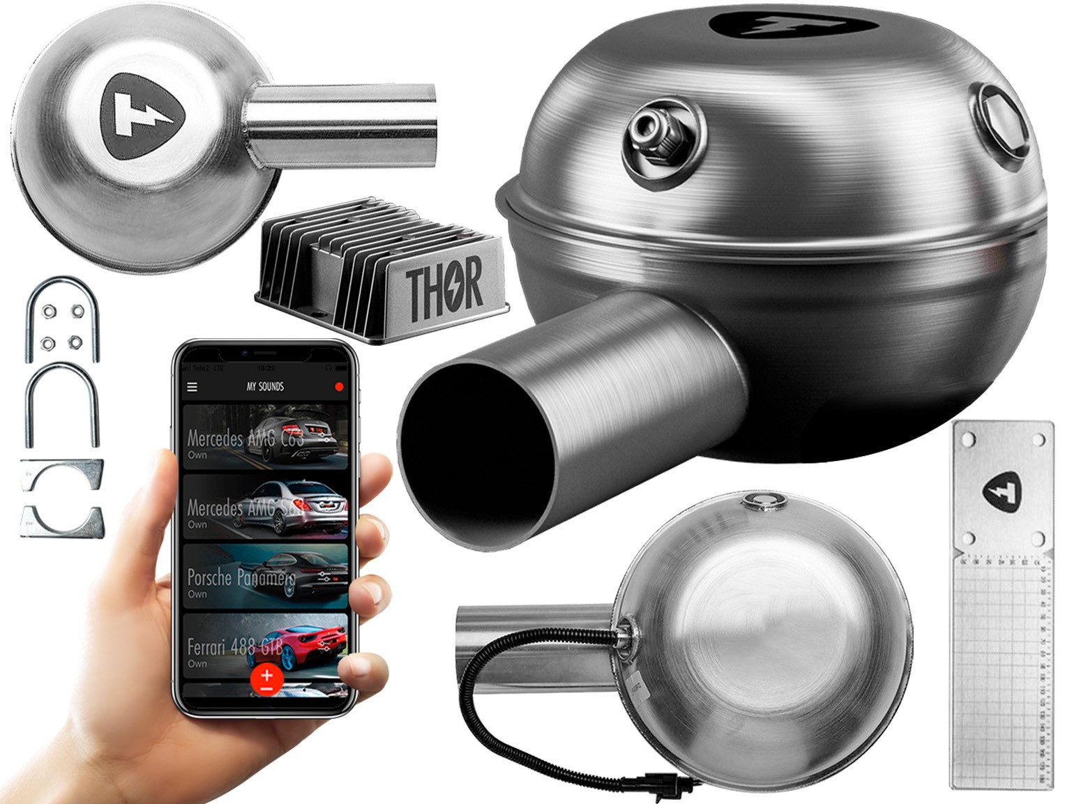 Активный выхлоп Thor состоит из очень мощного генератора звука, кабелей, контроллера Bleutooth и усилителя звука.