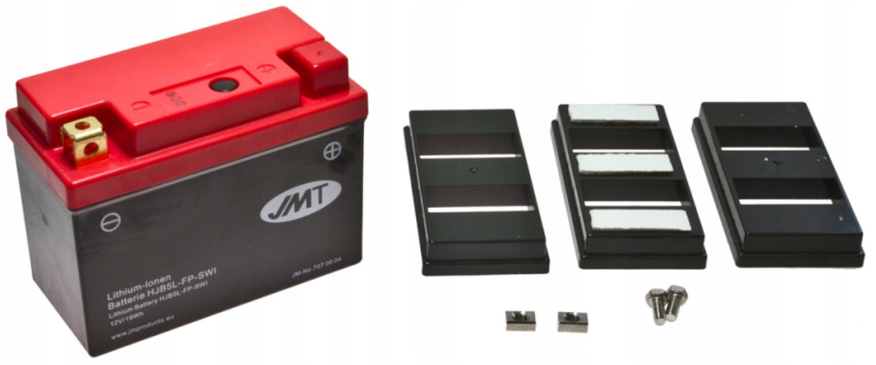 Литий-ионные аккумуляторы JMT благодаря своей конструкции покрывают почти 90% спроса рынка мотоциклов. Их главное преимущество – очень малый вес. Отсюда их широкое использование в мотоспорте из-за относительно дешевого, по сравнению с другими методами, снижения веса мотоцикла.