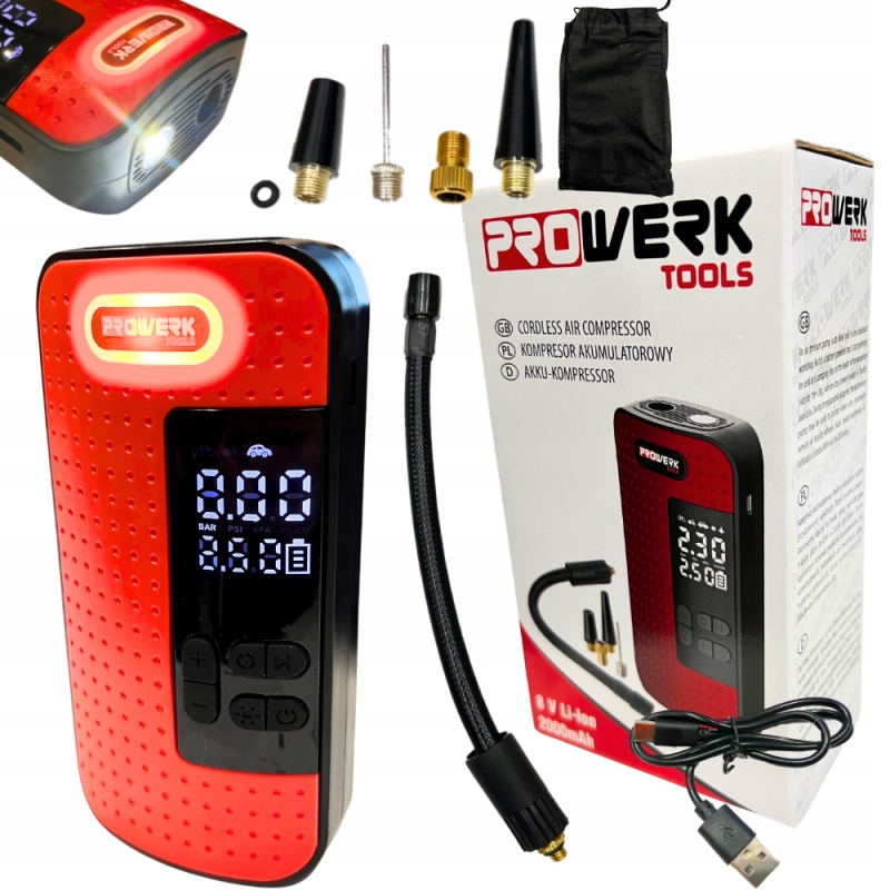Беспроводной компрессорный насос со встроенным светодиодным фонариком и аккумулятором 2000 мАч — это инновационный инструмент, который обеспечит вам комфорт и безопасность во время езды на велосипеде. Этот компактный и практичный велосипедный/автомобильный насос – незаменимый спутник каждого велосипедиста и водителя, который хочет быть готовым к любой ситуации. Компрессор оснащен фонариком, который освещает шину, что облегчает накачивание шины в ночное время.