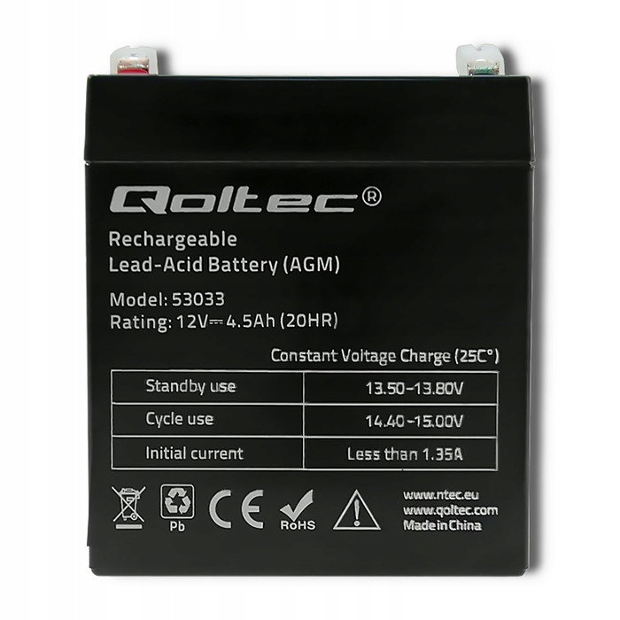 Аккумулятор Qoltec AGM | 12 В | 4,5 Ач | Не требует обслуживания | Эффективный | Лонглайф | до UPS, весов, кассового аппарата
