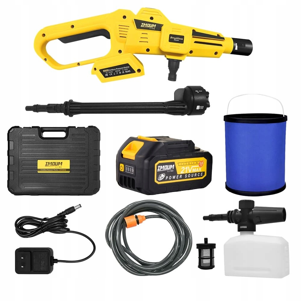 - Комплектация: 1 аккумулятор, зарядное устройство, копье с насадкой 6-в-1, пенораспылителем с баком, наливным шлангом длиной 5 м с быстроразъемным соединением 1/4", фильтром для воды, складным ведерком, руководством пользователя, чемоданом.