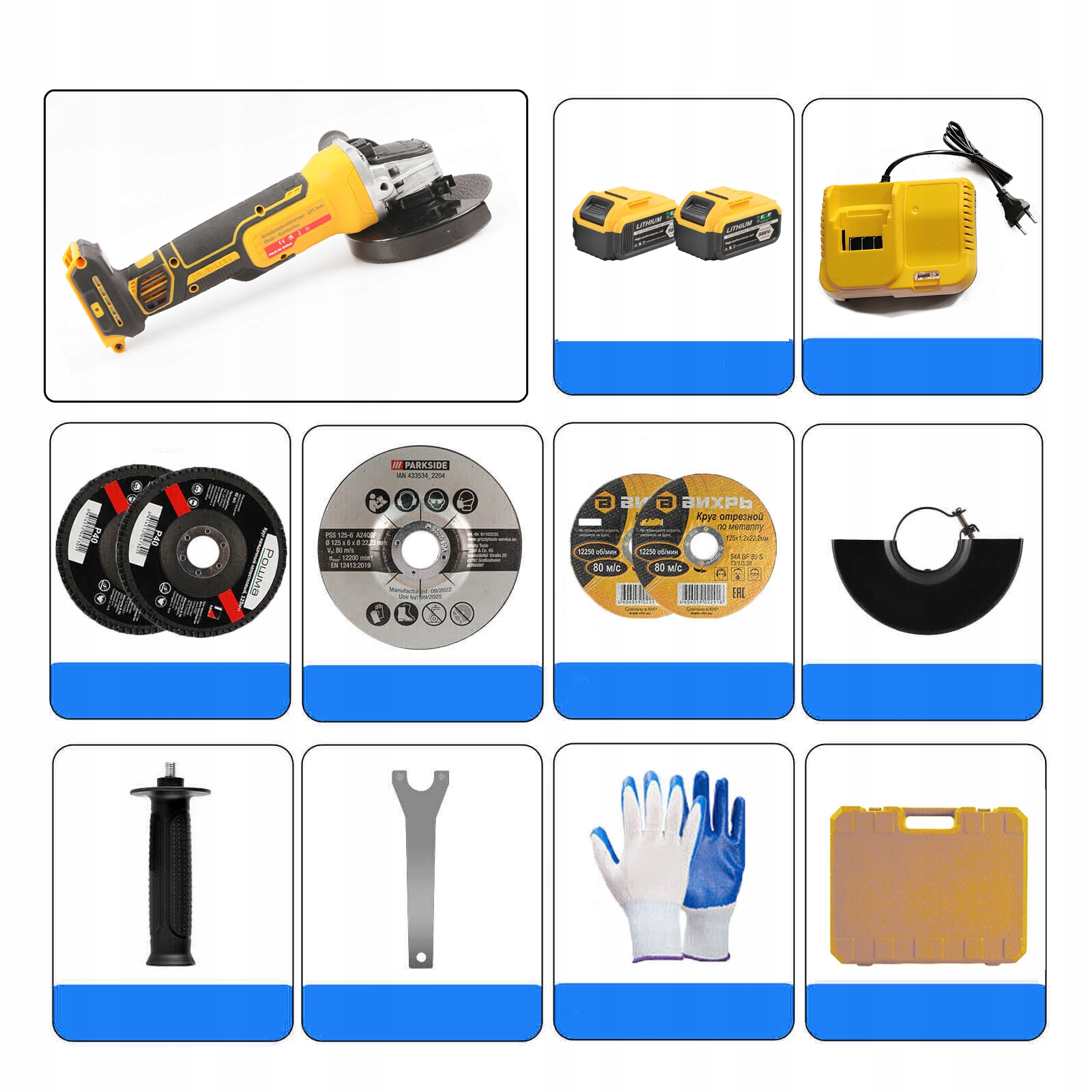 Угловая шлифовальная машина + 2 аккумулятора по 6,0 Ач + детали: