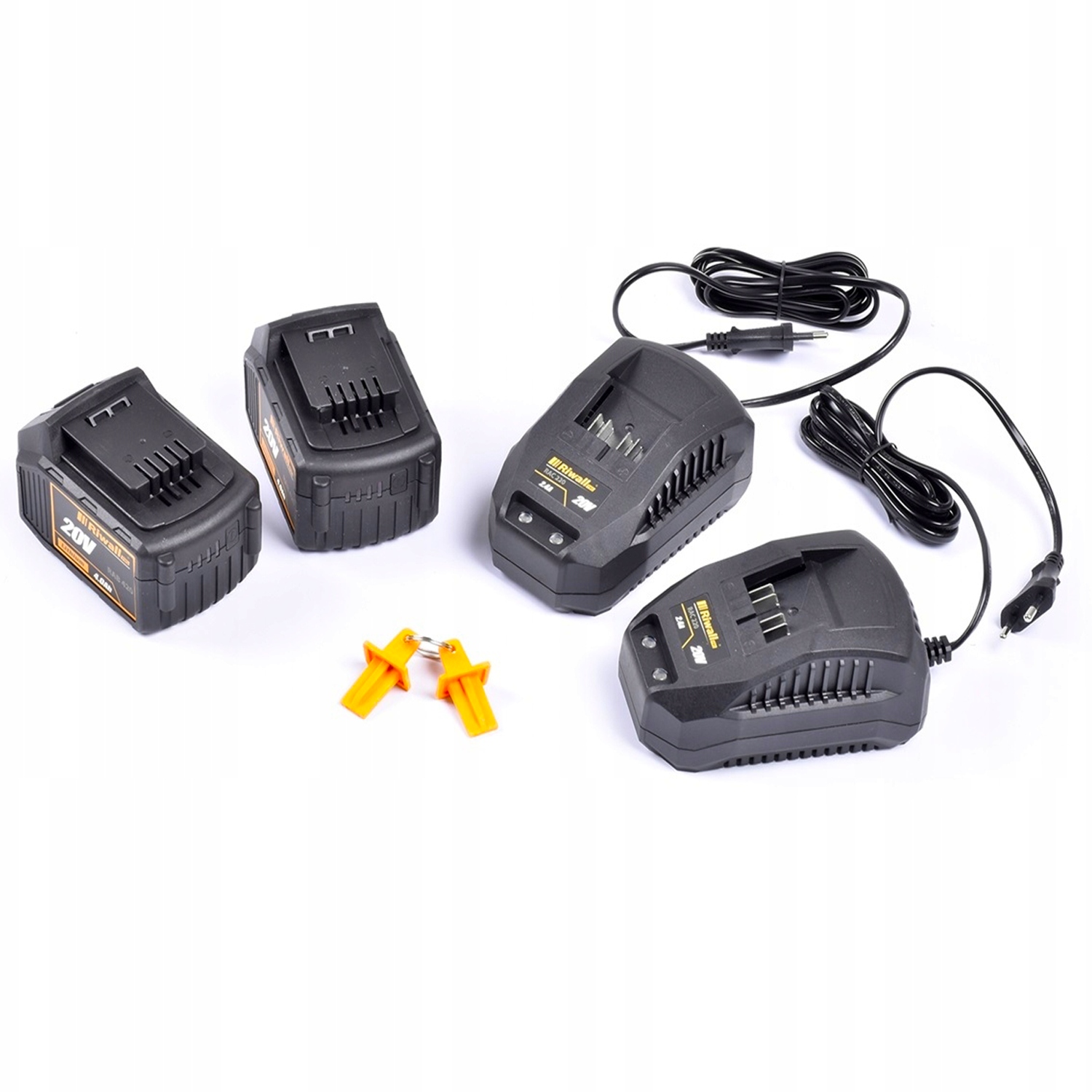 - В комплектации вы получите два мощных аккумулятора большой емкостью 4 Ач и два зарядных устройства, способных заряжать аккумуляторы за 90 минут