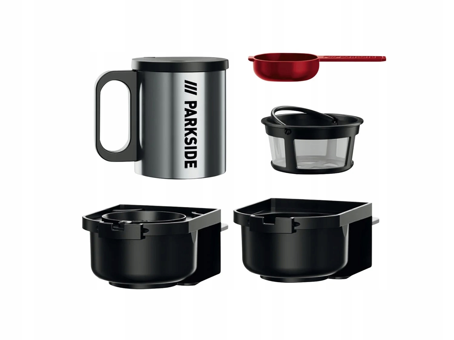 ✔ Аксессуары в комплекте: держатель для капсул, ситечко, чашка с крышкой, мерный стаканчик для кофе