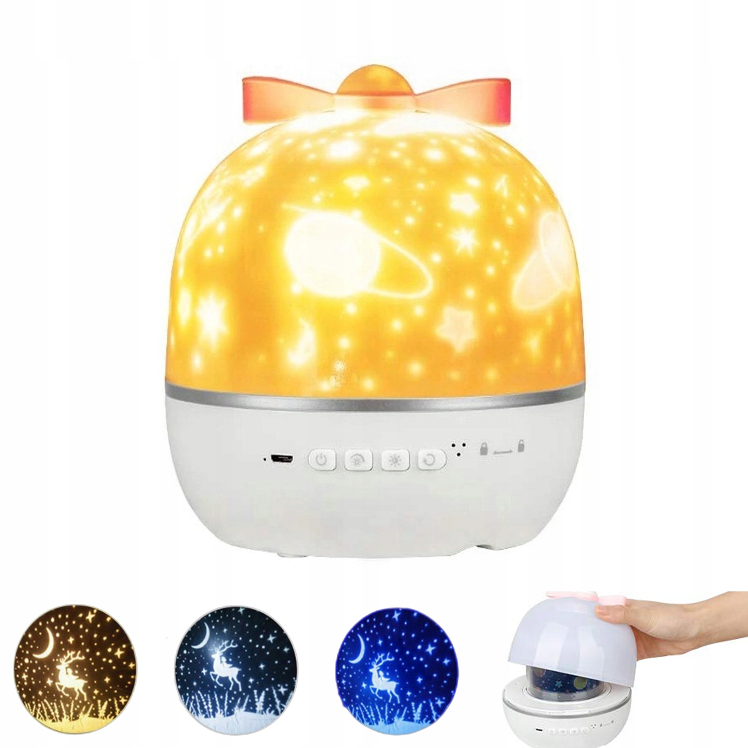 - Динамическая многоцветная проекция: Есть 4 на передней части кнопки ночника. Кнопка 1: Вкл/Выкл. Кнопка 2: Уровень яркости, 3 регулируемых уровня яркости, максимальная яркость для чтения и самая низкая для сна. Кнопка 3: Изменение цвета: синий, желтый, белый, непрерывное, медленное осветление и смешивание, вы можете выбирать между одним цветом и смешанным цветом по мере необходимости. . Кнопка 4: управление вращением.