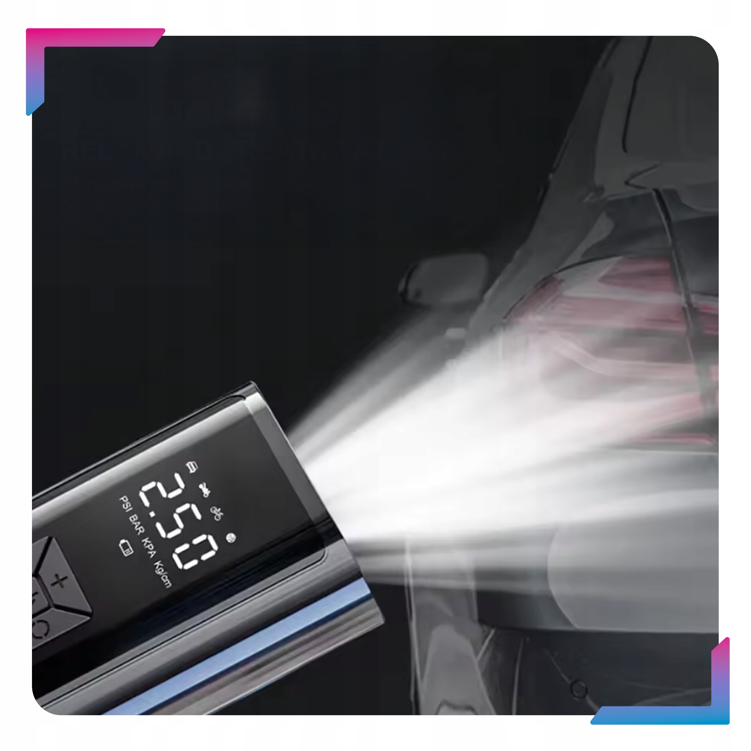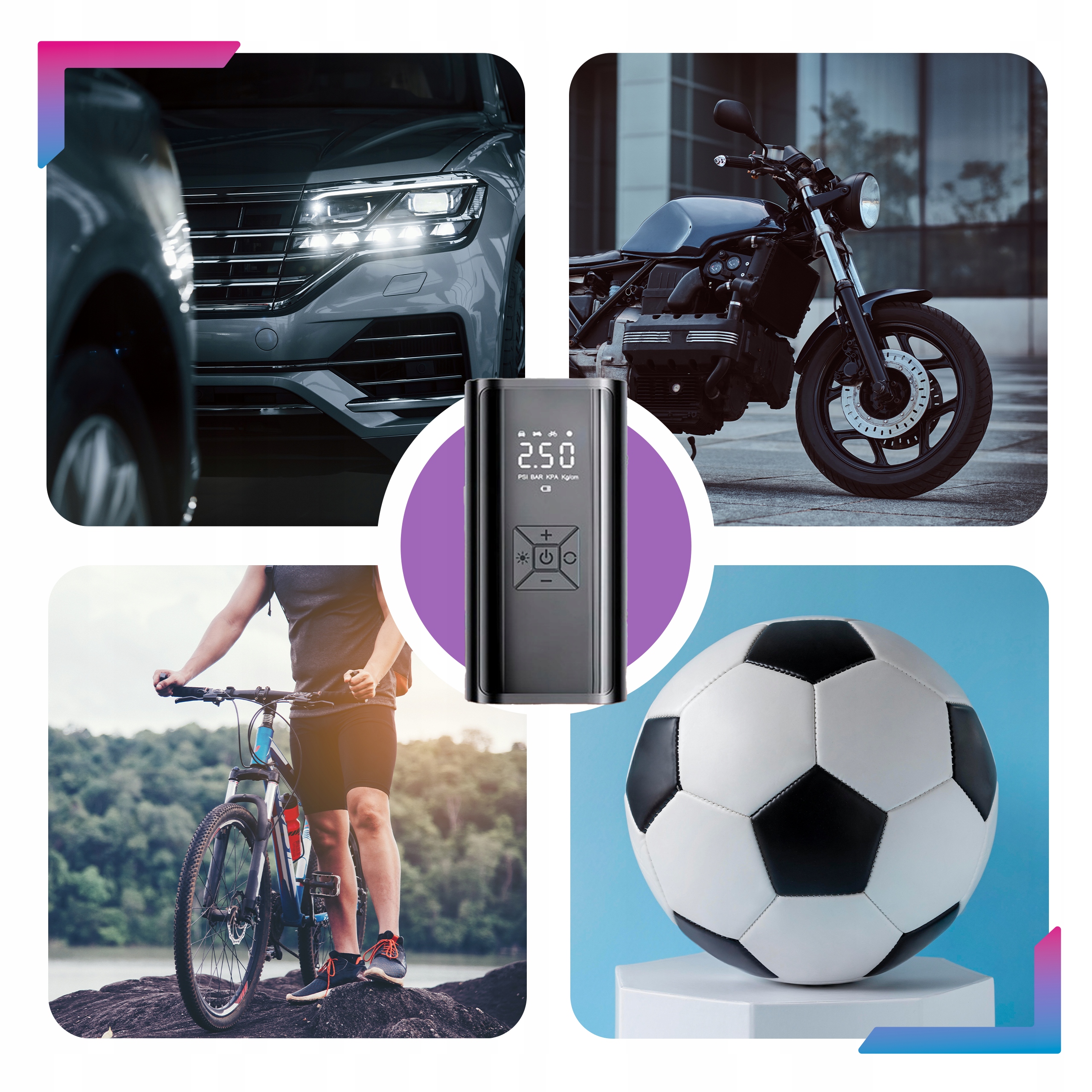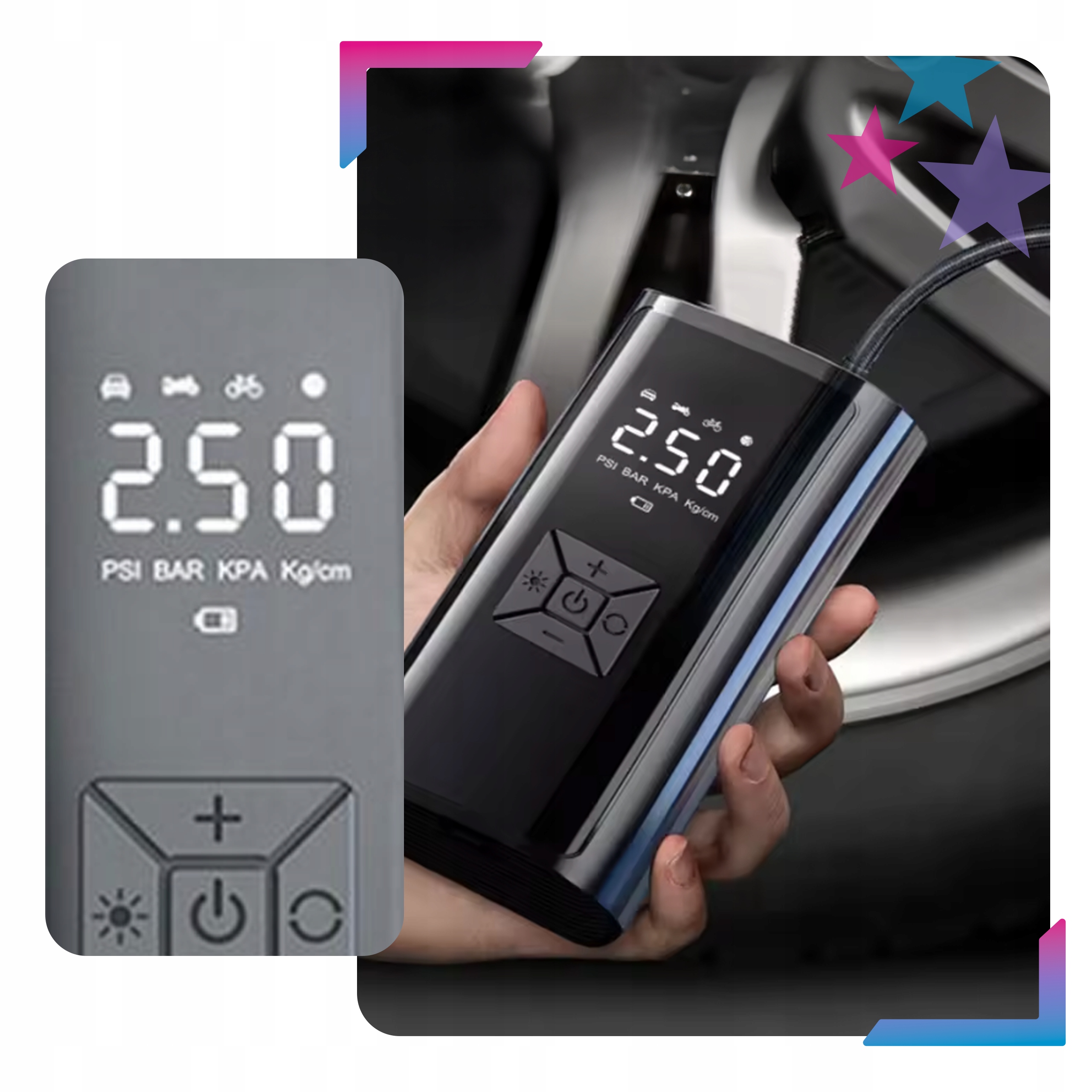 Наш мобильный компрессор со светодиодным экраном имеет целых 5 режимов работы (4 уже заданных и 1 пользовательский), позволяющих удобно накачивать колеса автомобиля, мотоцикла и велосипеда, а также матрасы, бассейны, мячи и надувные игрушки.