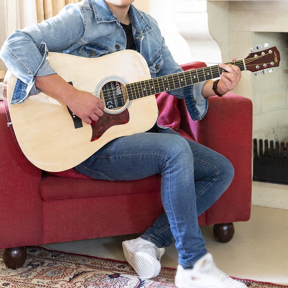 Эта акустическая гитара идеально подходит для всех, кто хочет начать играть на гитаре или решает вернуться в игру, но не хочет тратить целое состояние (фантастическое сочетание качество и цена). Инструмент полноразмерный, имеет стальные струны. Корпус выполнен в классическом стиле дредноут, обеспечивая потрясающий звук в сочетании с западным внешним видом. Эта модель подойдет людям всех возрастов. Благодаря всем необходимым аксессуарам, входящим в комплект, вы можете сразу начать свое музыкальное приключение.