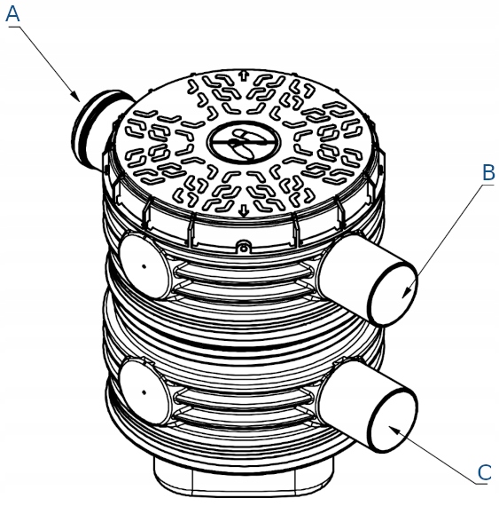 Фильтр переполнения изготовлен из полиэтиленовой PEHD с высокой плотностью. Корпус фильтра изготавливается путем вытягивания пластиком и покрывает инъекцию. Подключения к фильтру плотно приварены к телу.