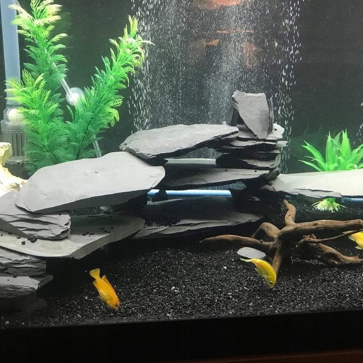 Темная тонкая плитка для укладки в аквариуме. При контакте с водой они значительно темнеют, а в сочетании с освещением аквариума приобретают едва заметное свечение. Камень имеет естественные оттенки, которые придают ему дополнительный шарм. Темный цвет в сочетании с неправильной формой прекрасно контрастирует с зеленью растений и светлым субстратом в каменных аквариумах.