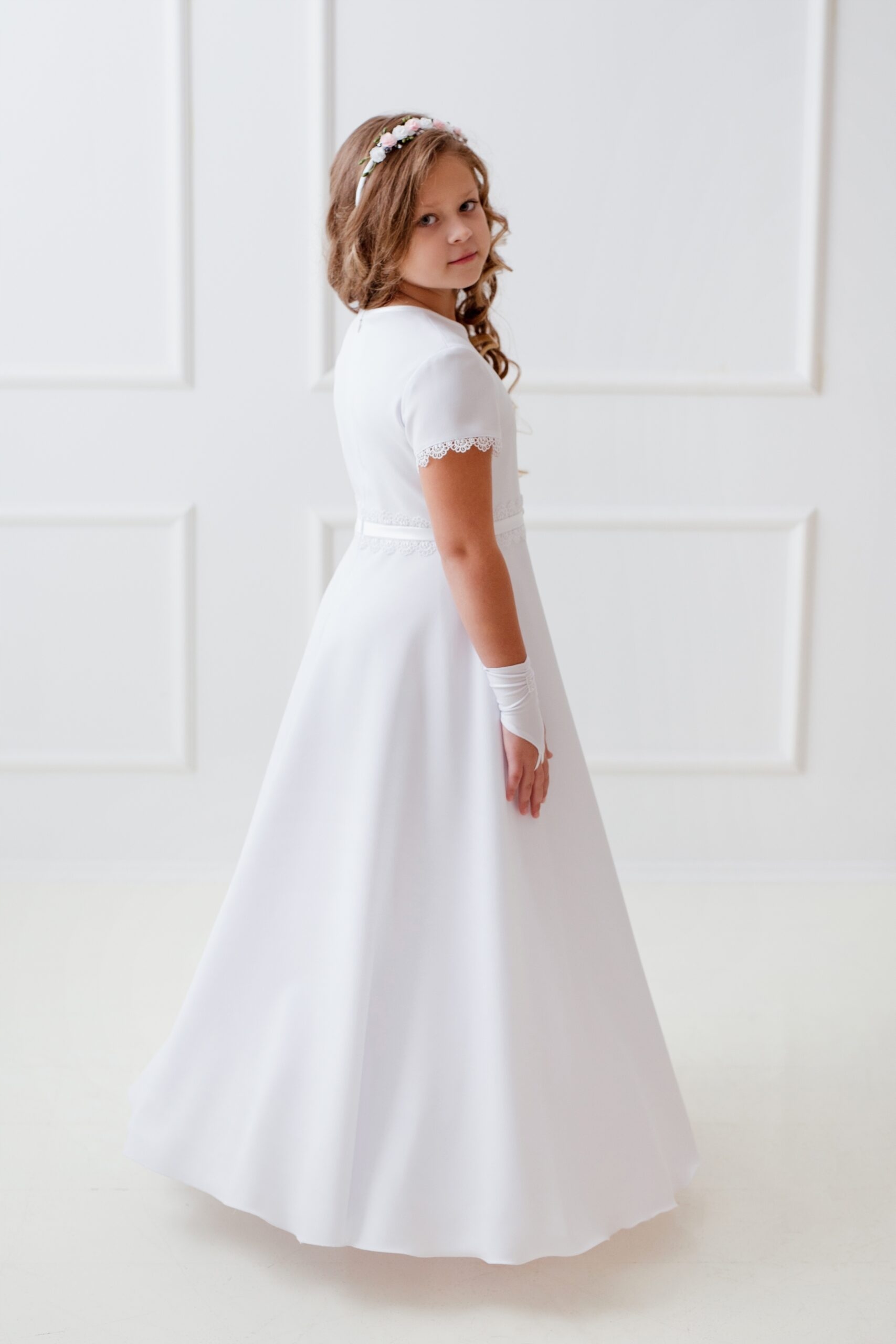 Платье для причастия с вырезом на талии. Пояс с декоративным кружевом и красивым серебряным декором. Верх платья на подкладке, от талии пришита подъюбник с фатином (возможно надеть обруч, который входит в комплект платья).