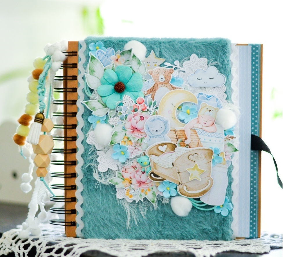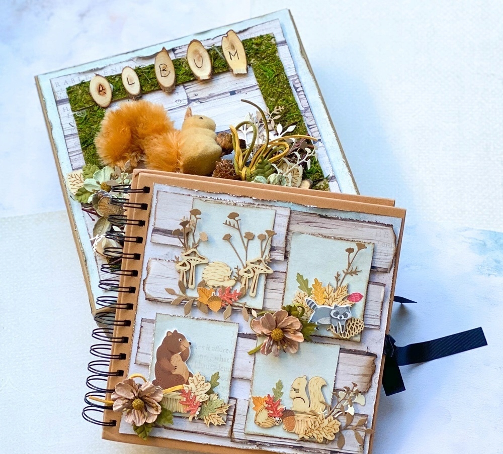 Альбом крепится на пружину и перевязывается лентой в тон крафта.