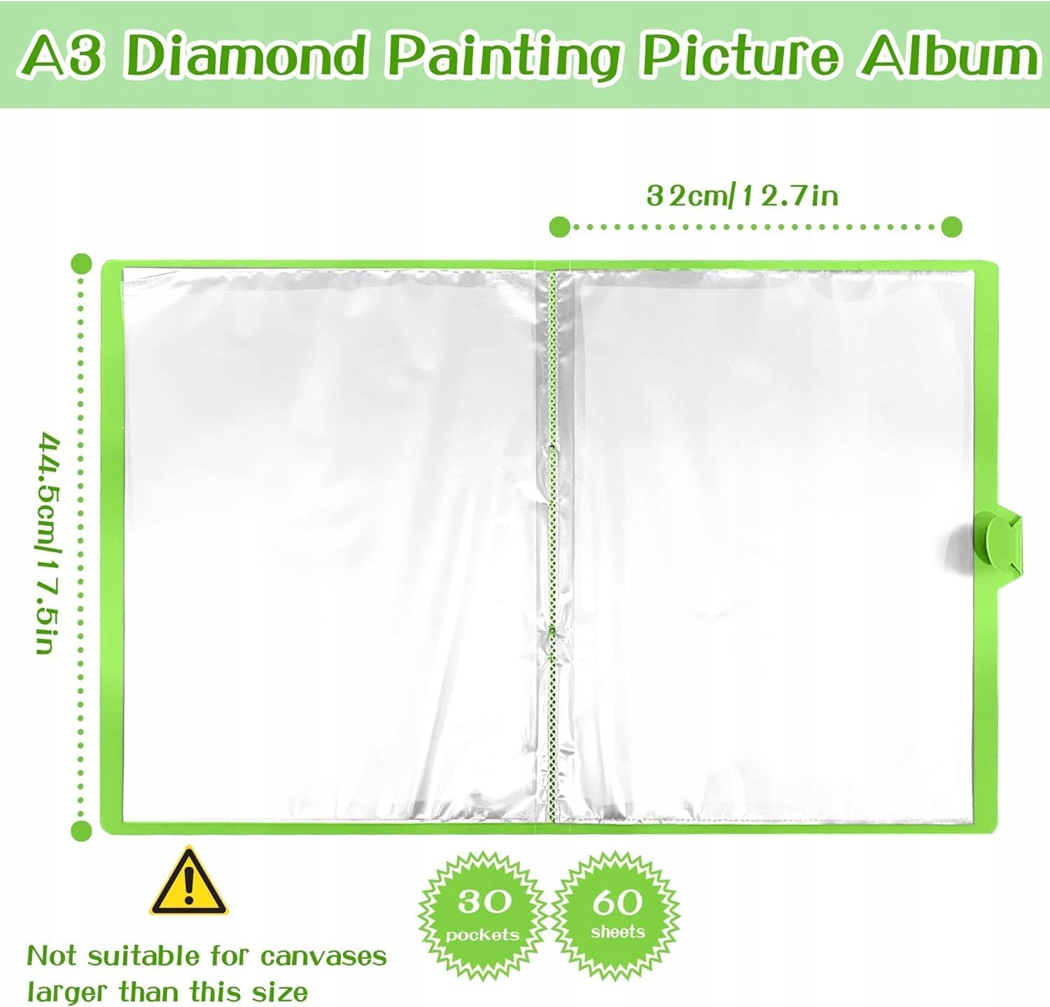 - Альбом с алмазной живописью А3 - размеры обложки: 43,7 см x 31,7 см, 30 отделений для хранения книг (42 х 31 см), 60 видимых страниц для боковой загрузки.